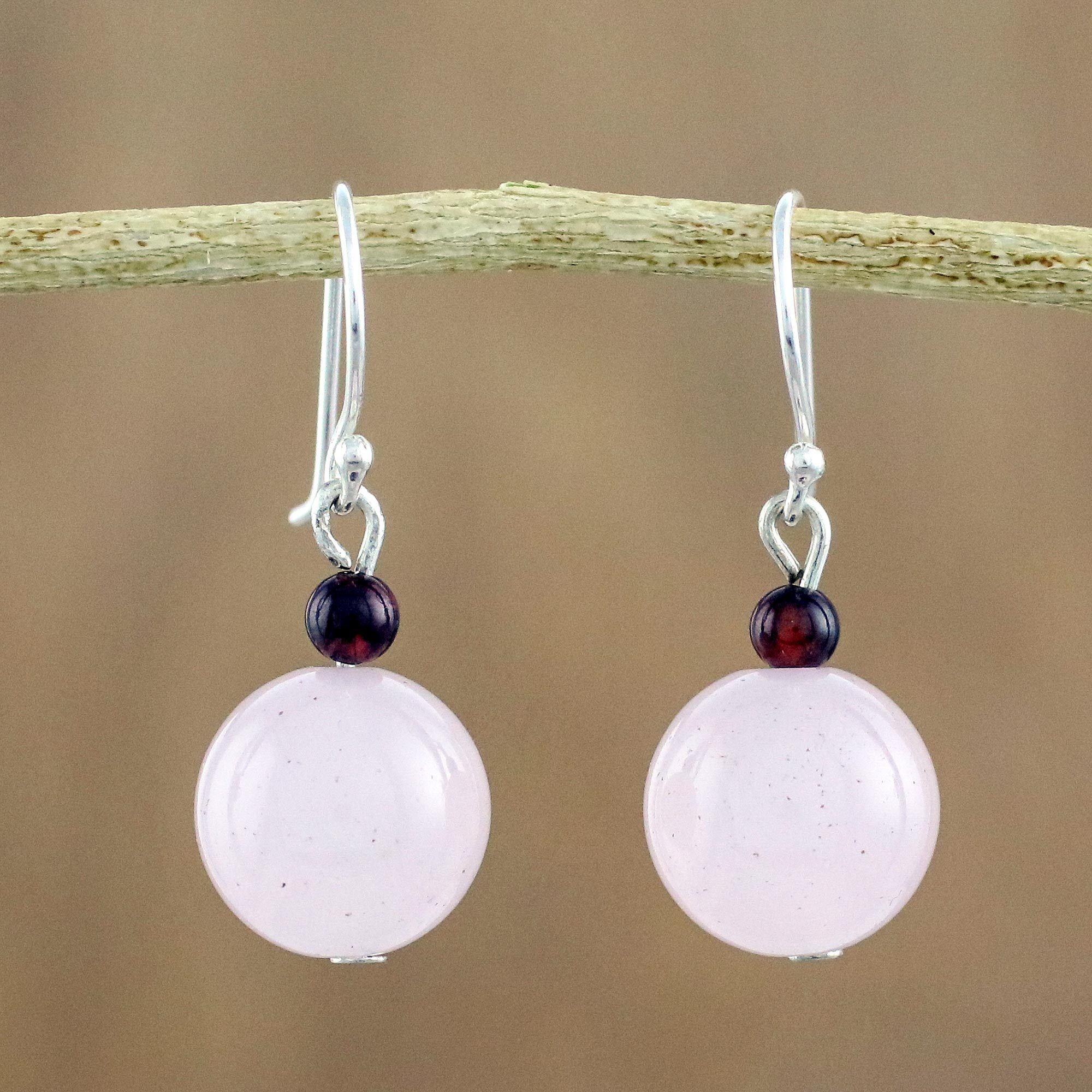 Deliciously sweet rose quartz beads distinguish these dangle earrings from Thai artisan Matta. The artisan pairs the rosy gems with small garnet beads for a harmonious duet. The earrings swing from sterling silver hooks.