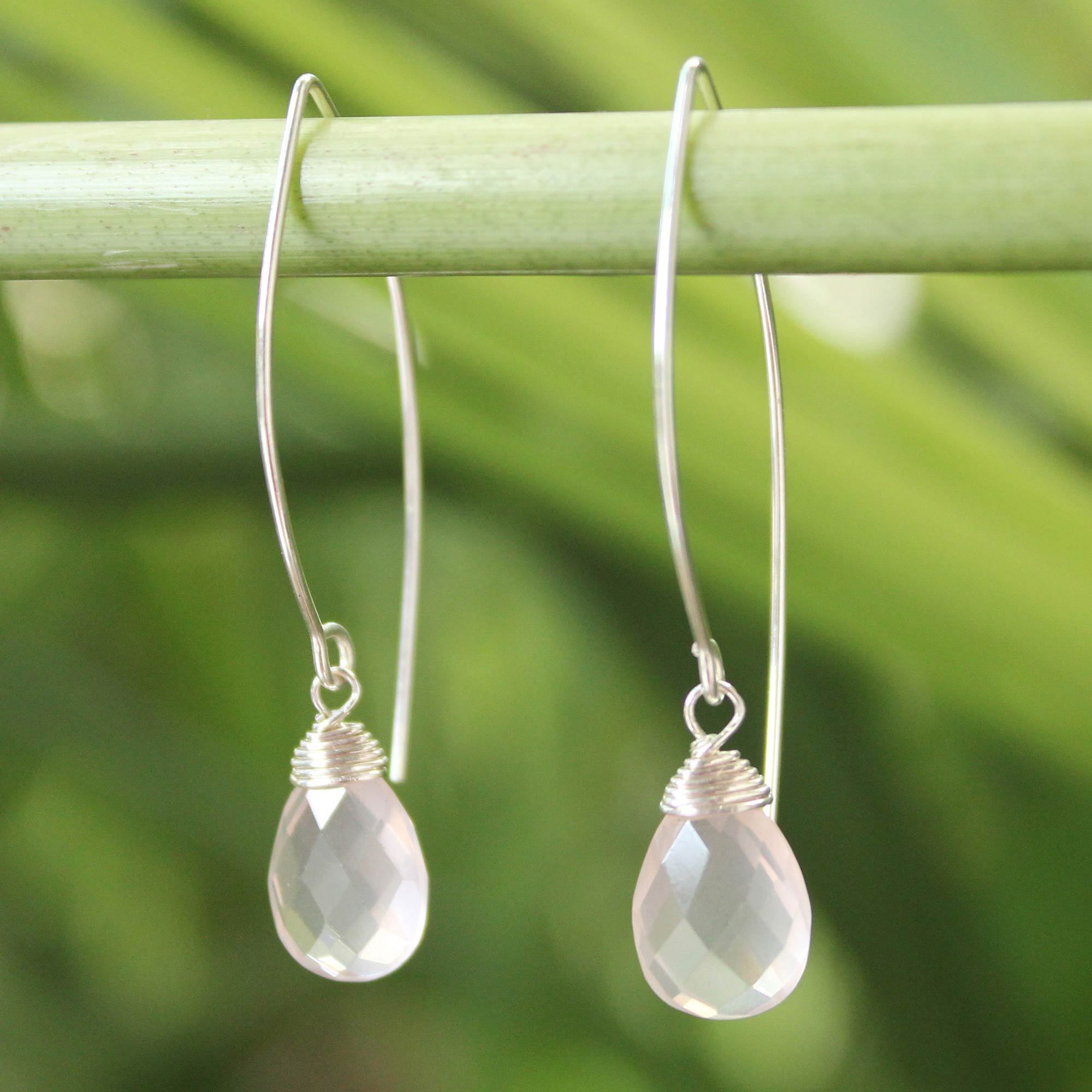 Rose quartz buds glow with the promise of elegance in a sublime earring design by Khun Boom. She sets the 5 carat gems inside silver swirls that fall from oval loops.