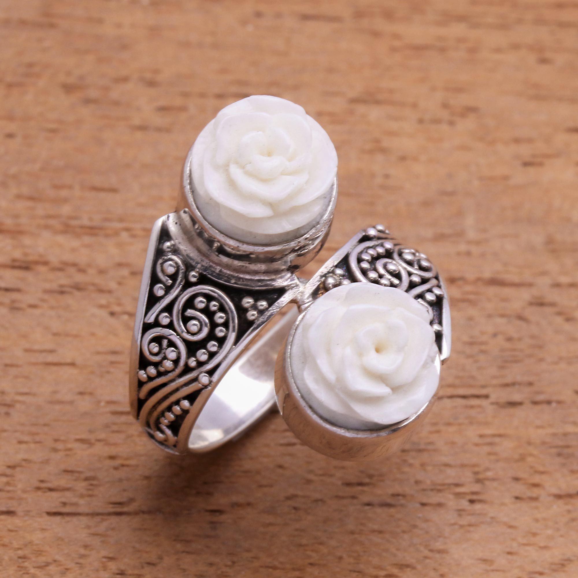 Hand-carved from bone, two sister roses crown this Javanese cocktail ring, designed by Rosalia Tarigan. Local artisans craft the band from sterling silver with intricate wire and dot motifs.