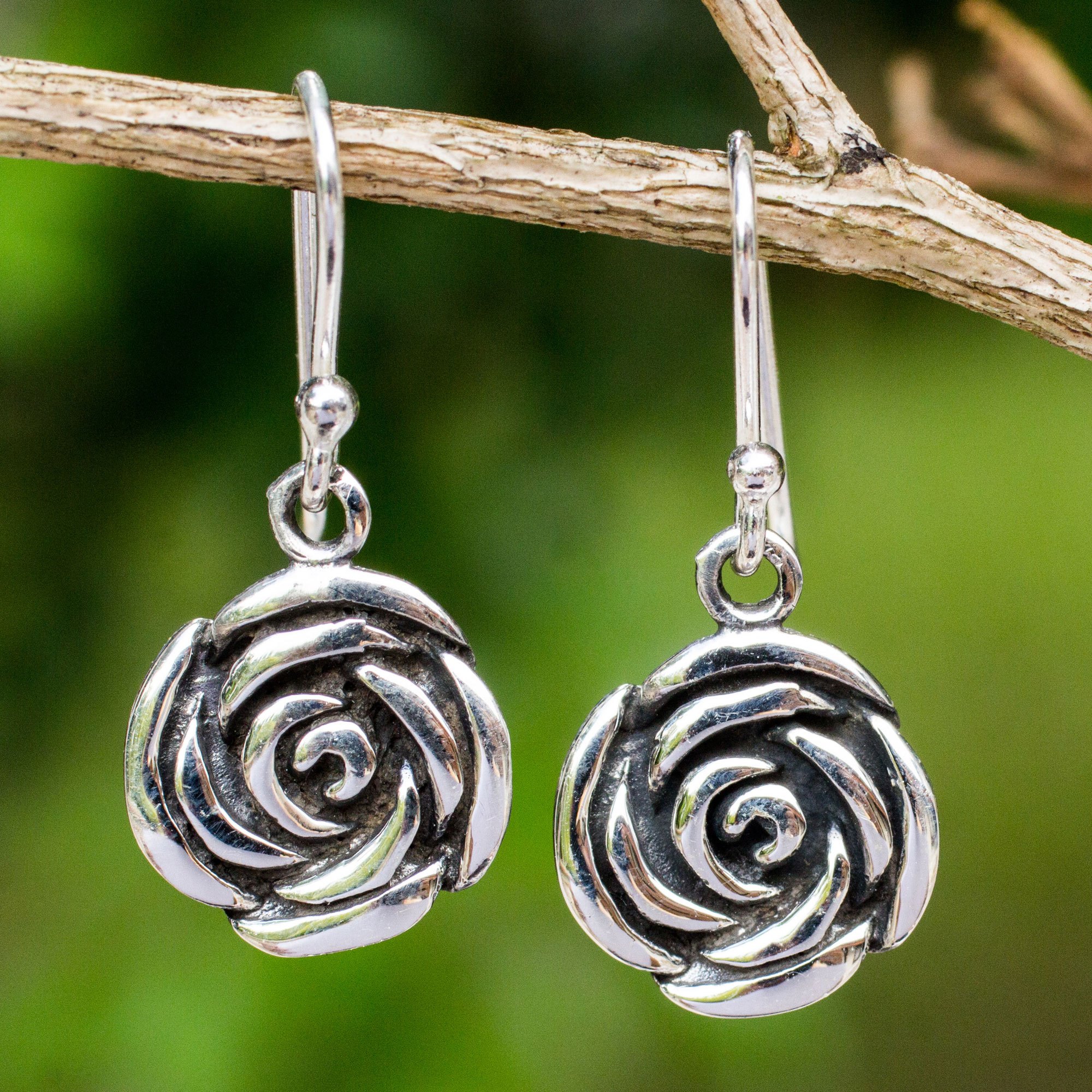 Roses in Handcrafted Sterling Silver Hook Earrings, 'Spiral Rose'