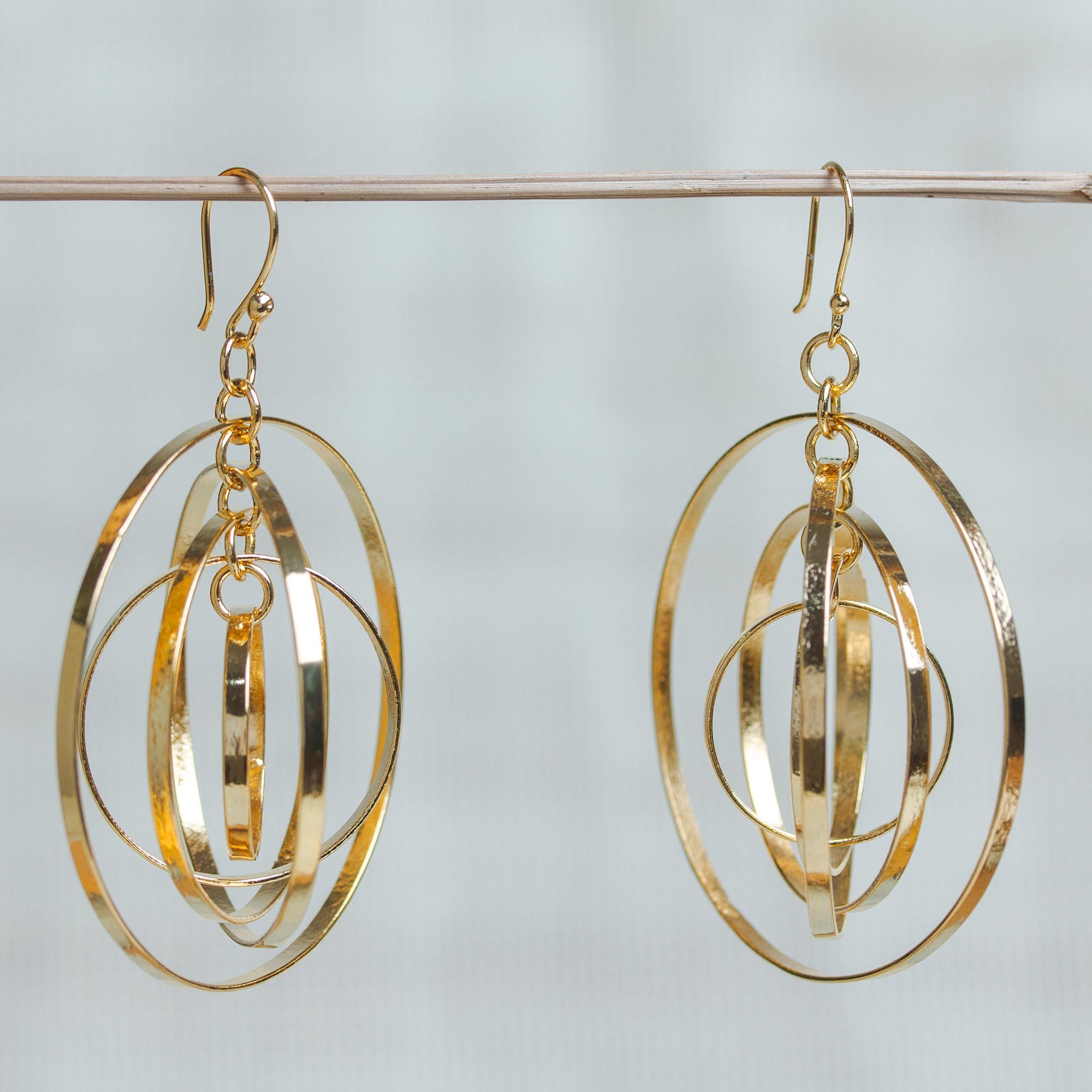 Concentric rings spin freely within each other in these great earrings from Carlos and Cynthia Rendon in Mexico. The dangle earrings are crafted from gleaming 24k gold plated zinc.