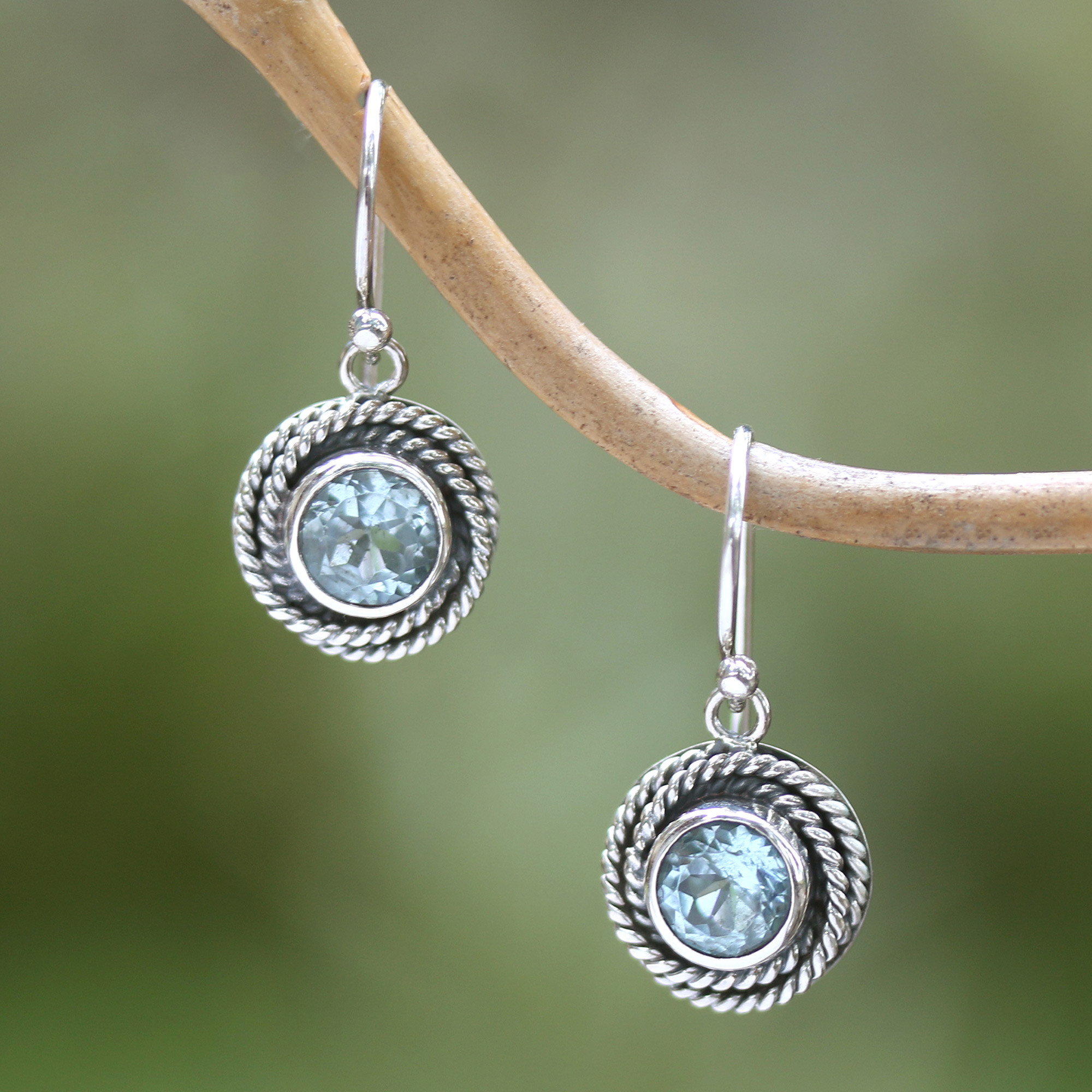 Featuring an original design by Indonesian artisan Wirabhuwana, this pair of dangle earrings features two carats of round blue topaz stones. The stones are framed by handcrafted rope motifs in sterling silver that coil around.
