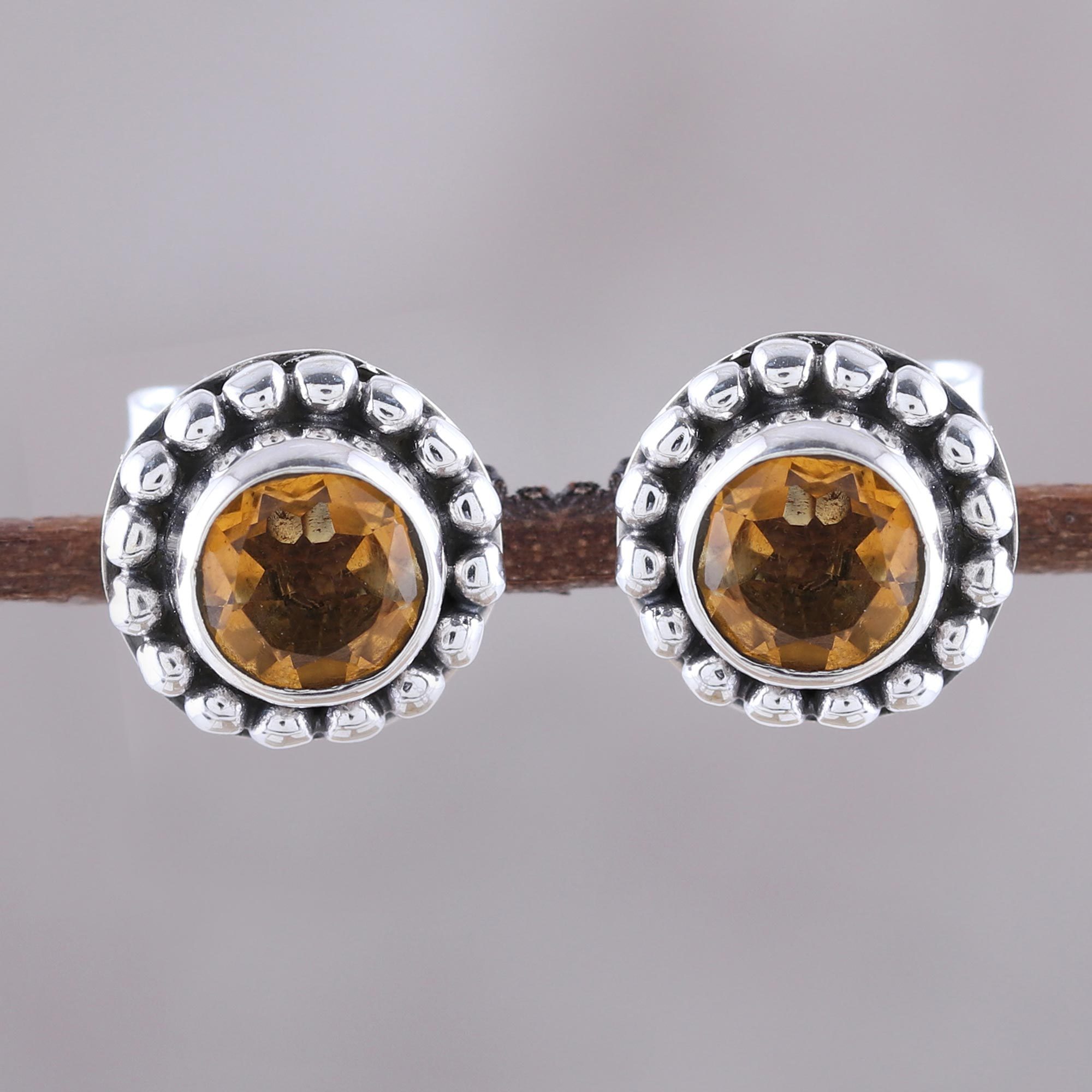 A round, faceted citrine gemstone, glistening like a pool of sunlight, is surrounded by sterling silver in a dot motif in this pair of stud earrings. These handcrafted earrings are presented by Neeru Goel of India.