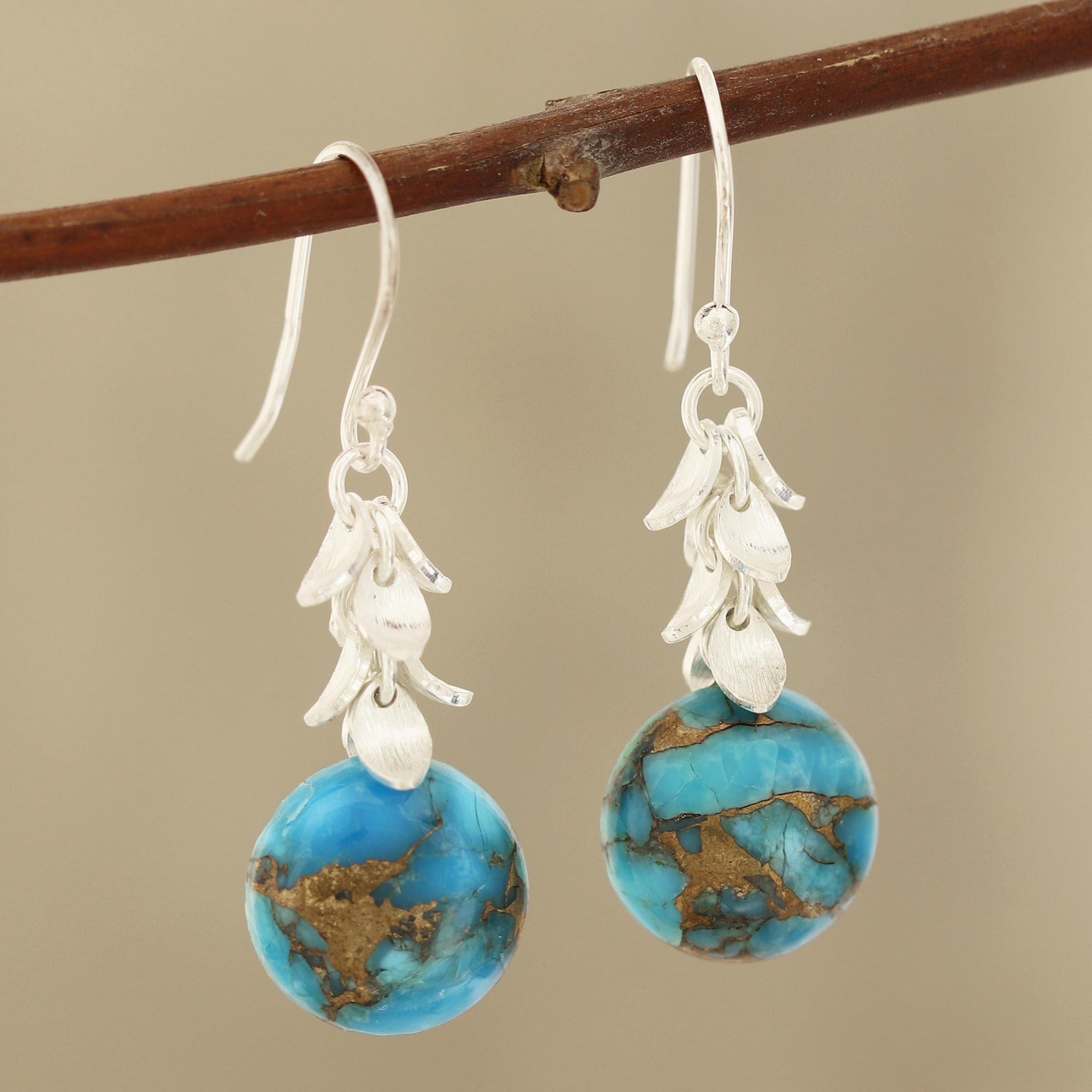 Dancing below petite petals of sterling silver, two orbs of composite turquoise are verdant and majestic. Indian artisan Bhavya Jain creates a wonderful pair of dangle earrings.