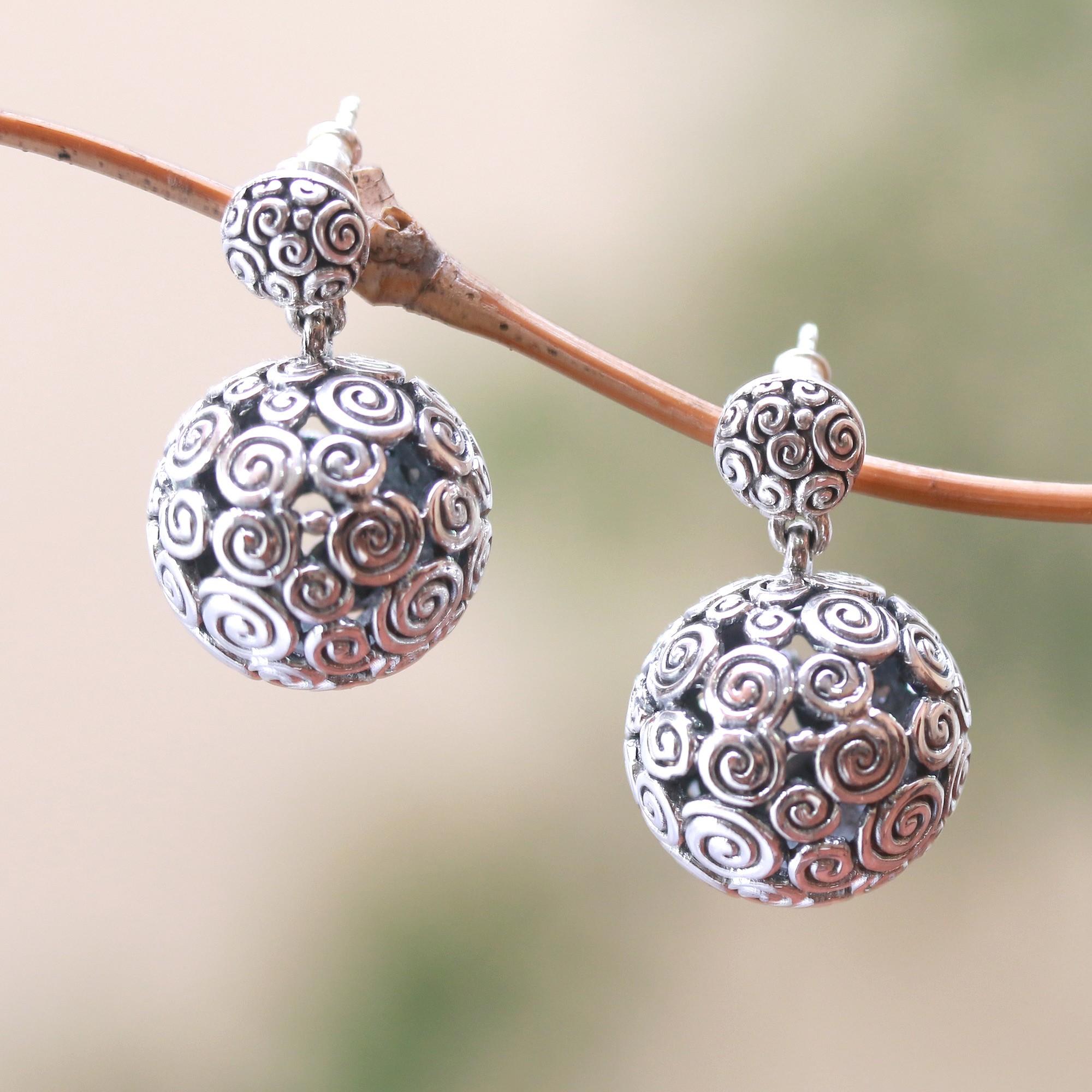 Radiant in their beauty, two orbs are crafted from sterling silver. Balinese artisan Zayd Makarim creates these dangle earrings, which are decorated with his characteristic "Buddha's curl" patterns.