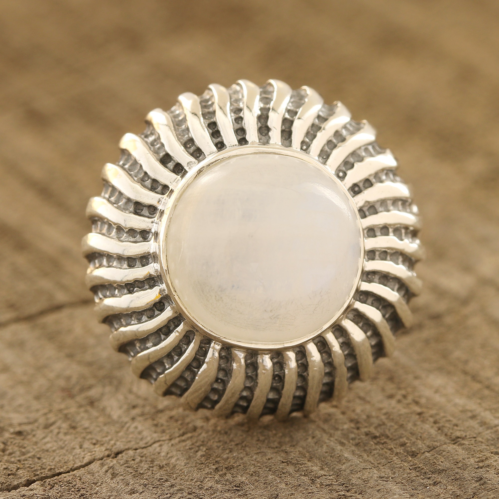 Capturing a blazing beauty, this cocktail ring from India evokes the moon. Neetu Barathi designs this ring, which features sterling silver tendrils that frame a round cabochon of natural rainbow moonstone. A combination of finishes accentuates the blazing patterns.