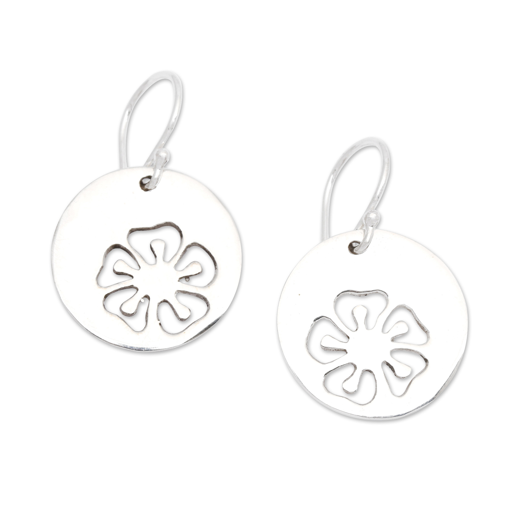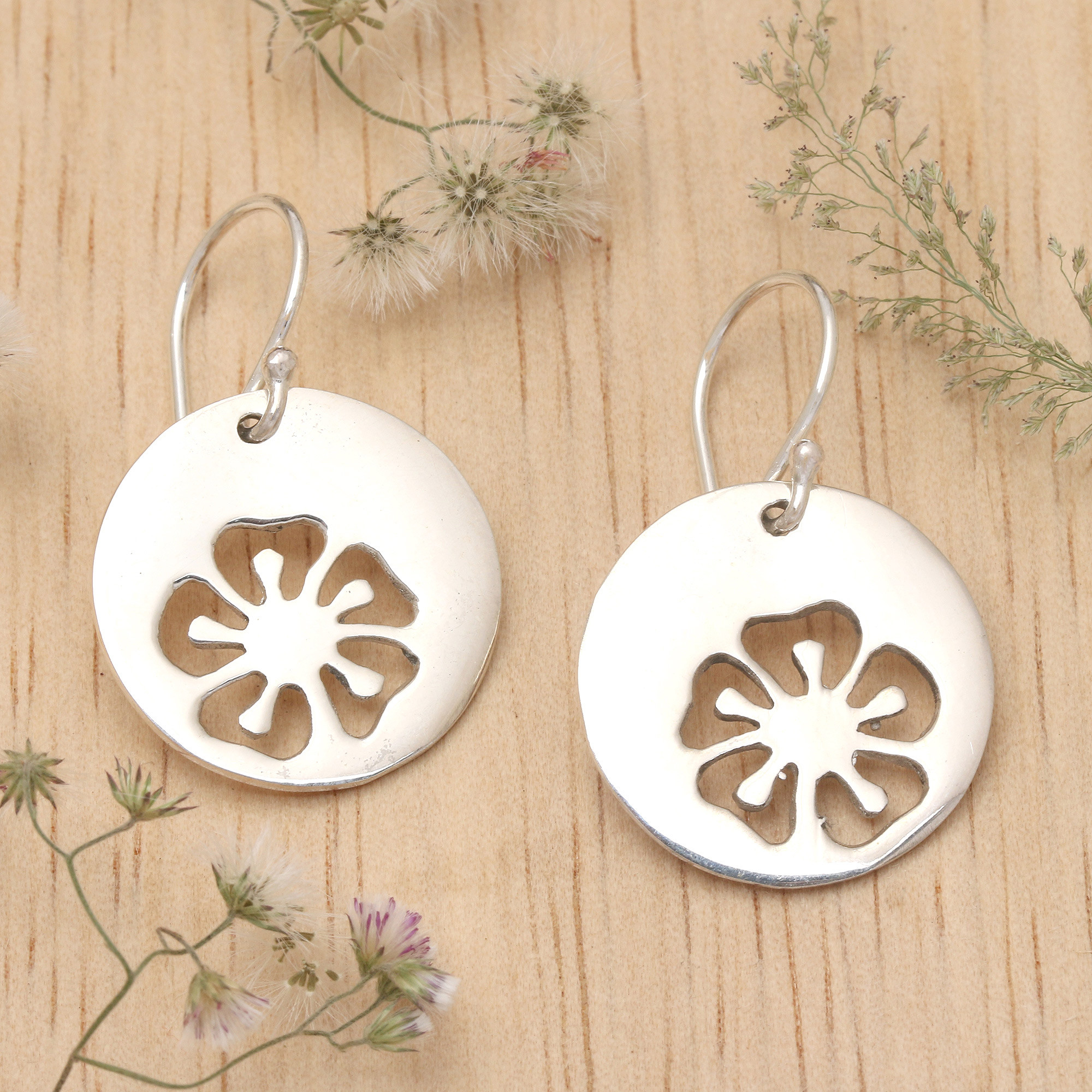 Round Sterling Silver Hibiscus Dangle Earrings Made in Bali, 'Hibiscus Shadow'