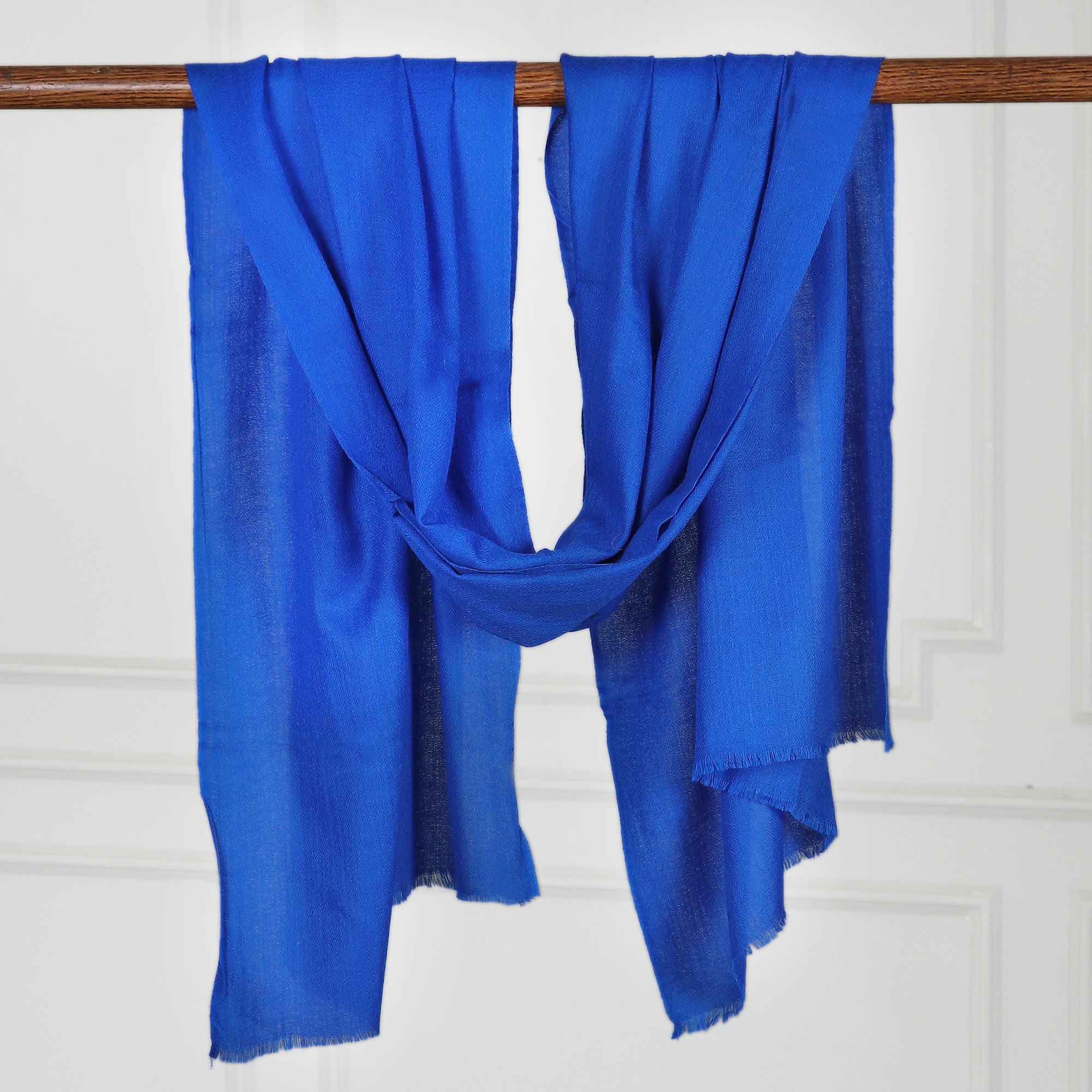 A dazzling royal blue shade defines this beautiful all-wool shawl from Indian artisan Sajad. The shawl is woven on a traditional hand loom in the classic chasm-e bulbul diamond pattern. The ends of the shawl culminate in a short fringe.