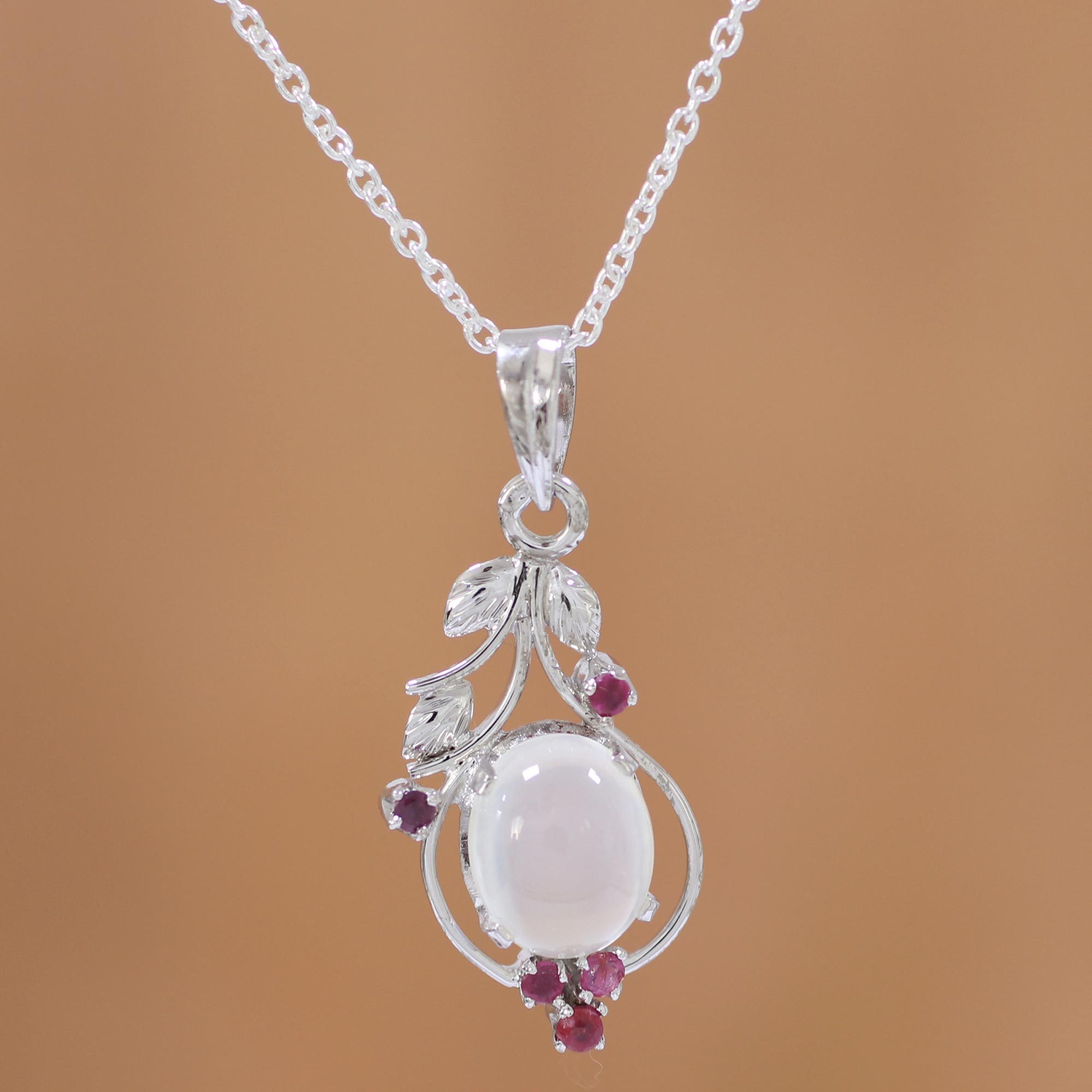 A shimmering moonstone seems to emerge from rhodium-plated sterling silver leaves in this necklace from India's Alok Jain. Two rubies grace the top of the pendant while another cluster of three gathers at the base of the moonstone to create a breathtaking necklace.
