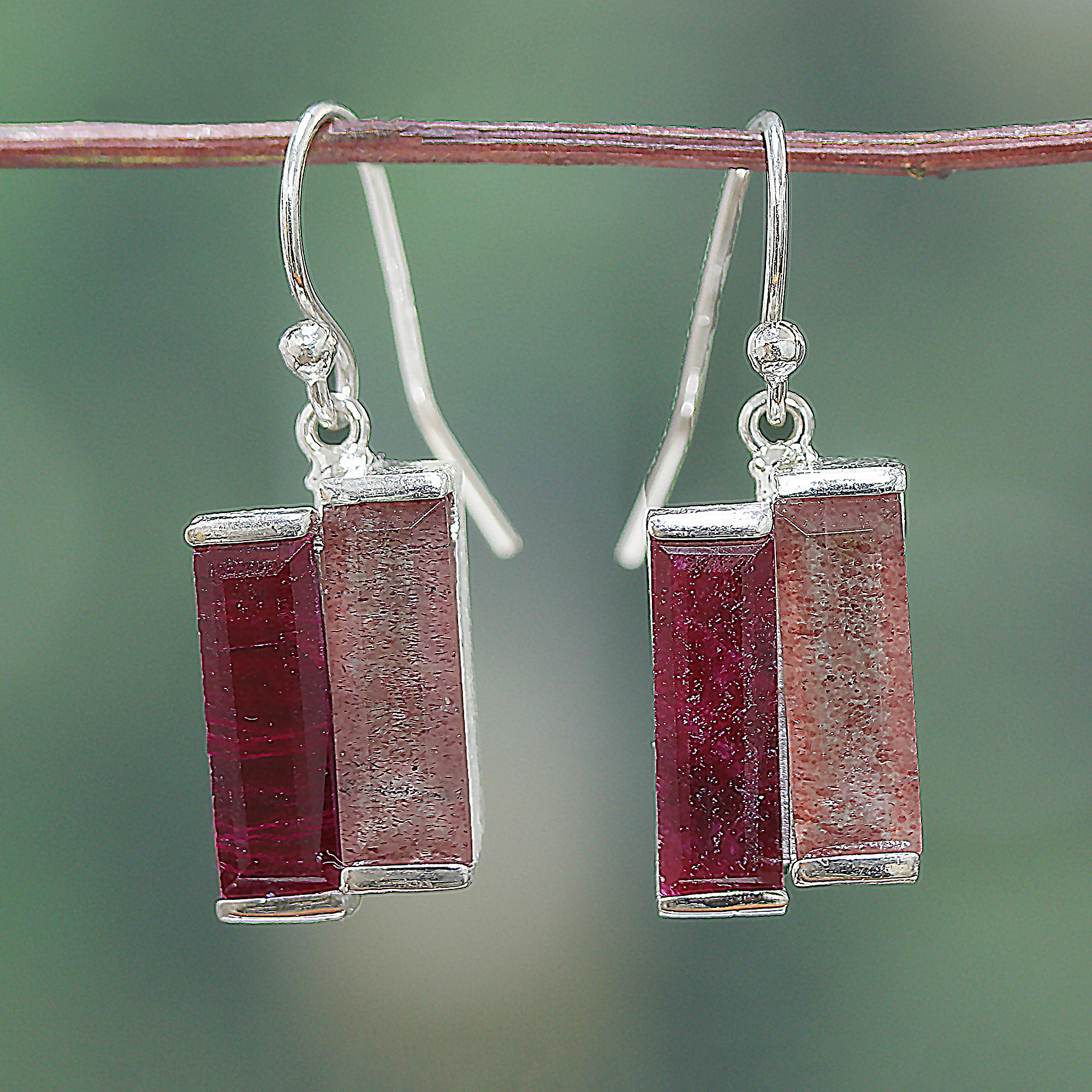 Ruby Quartz and Sterling Silver Double Bar Dangle Earrings, 'Pink Alliance'