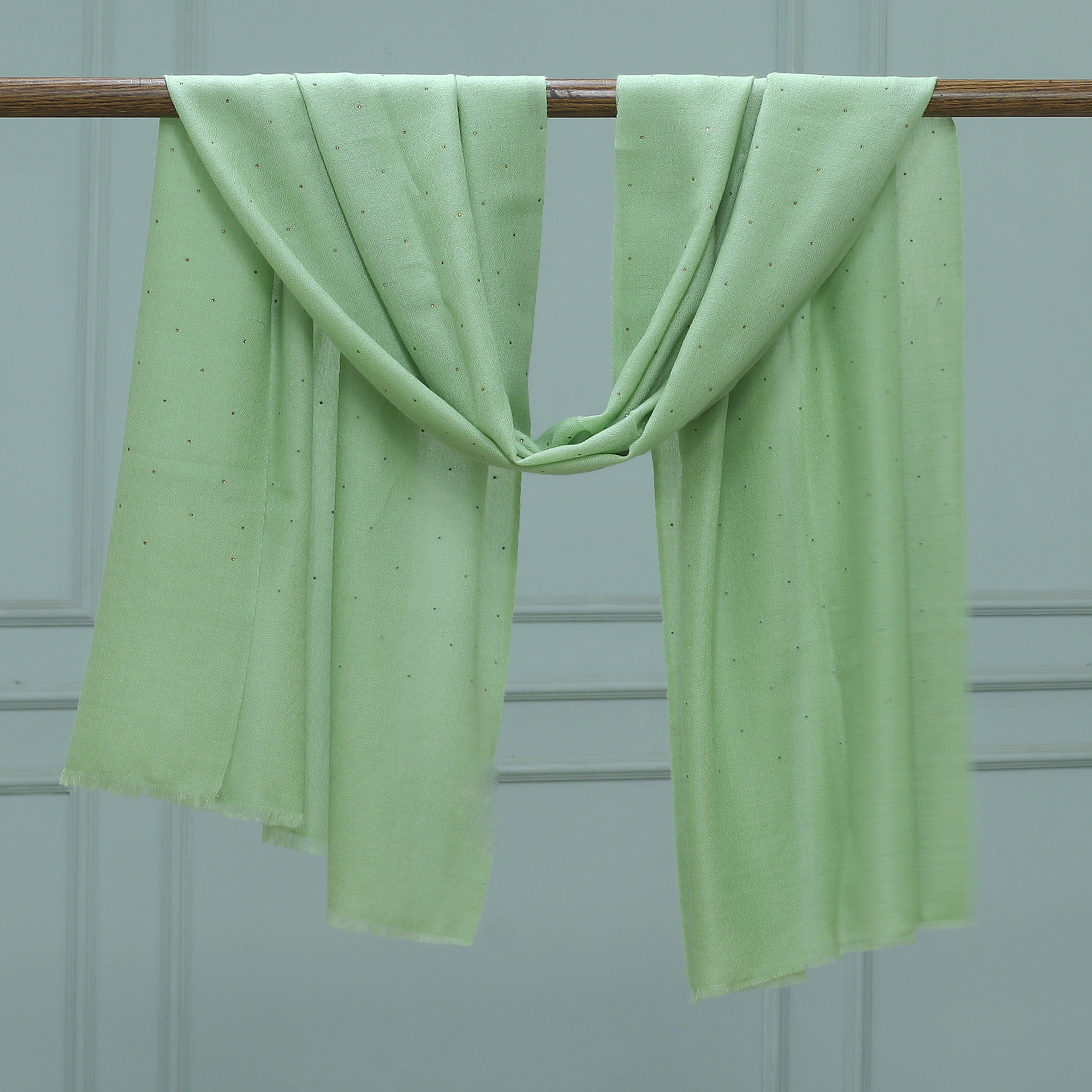 Refreshing and lightweight like a caress from the wind, this wool and silk shawl invites you to add a sage hue of serenity to your days, alongside sparkling details. Crafted by India's Shuja Ahmed, the piece completes its flowing drape with Swarovski crystals, allowing the accessory to captivate with peaceful vibes.