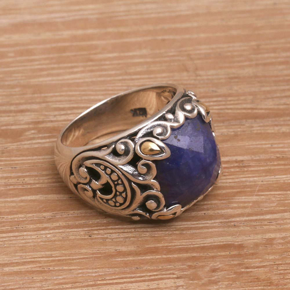 Add a touch of sophistication to your look with this gorgeous cocktail ring from Bali. Artisan Lenny designs the ring with six carats of faceted sapphire nestled elegantly in a prong setting. Local artisans craft the accessory by hand from sterling silver, with intricate vines decorating the band and four pear-shaped gold accents on the crown.