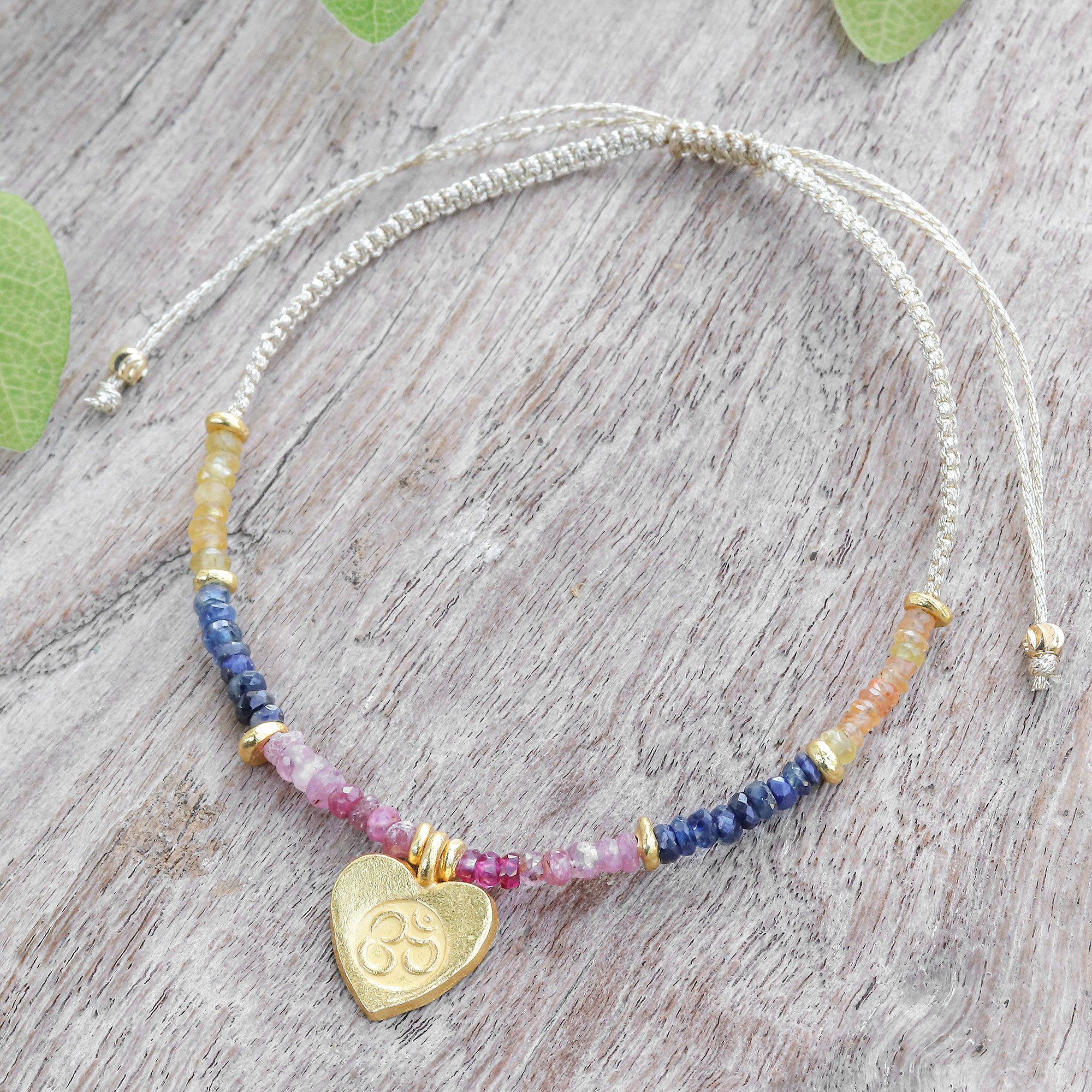 Wrap your wrist in a tapestry of texture where an intricately knotted cord meets crystalline beauty. Artisan Saranarat of Thailand weaves together pink, blue, yellow and white sapphire gems in this adjustable macrame creation. The gold-plated beads and heart-shaped pendant featuring the om symbol motif, along with petite brass beads on the ends, add subtle sparkle to every movement.