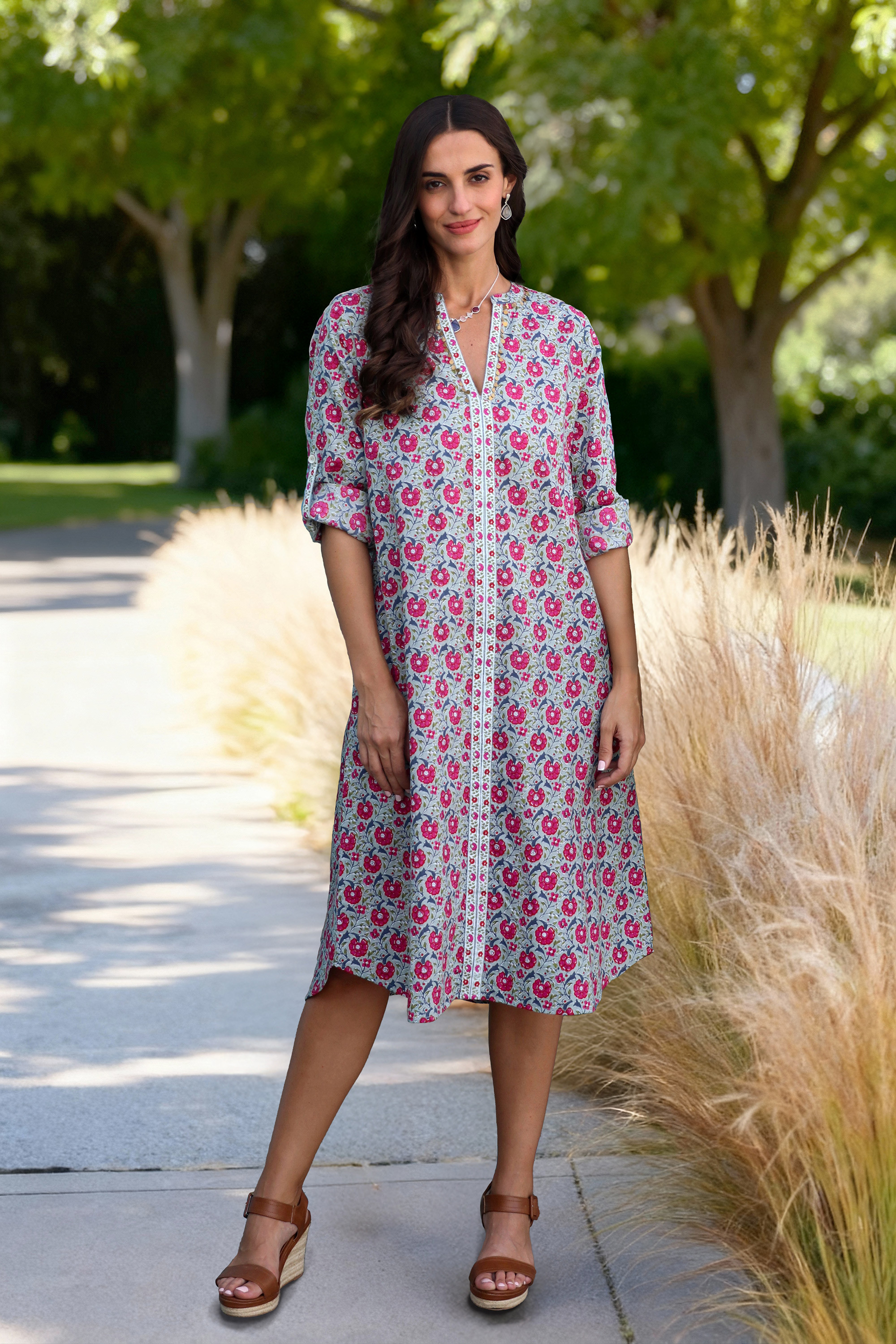 Printed Floral-Motif Shirt Dress with coin accents, 'Summer Stroll'