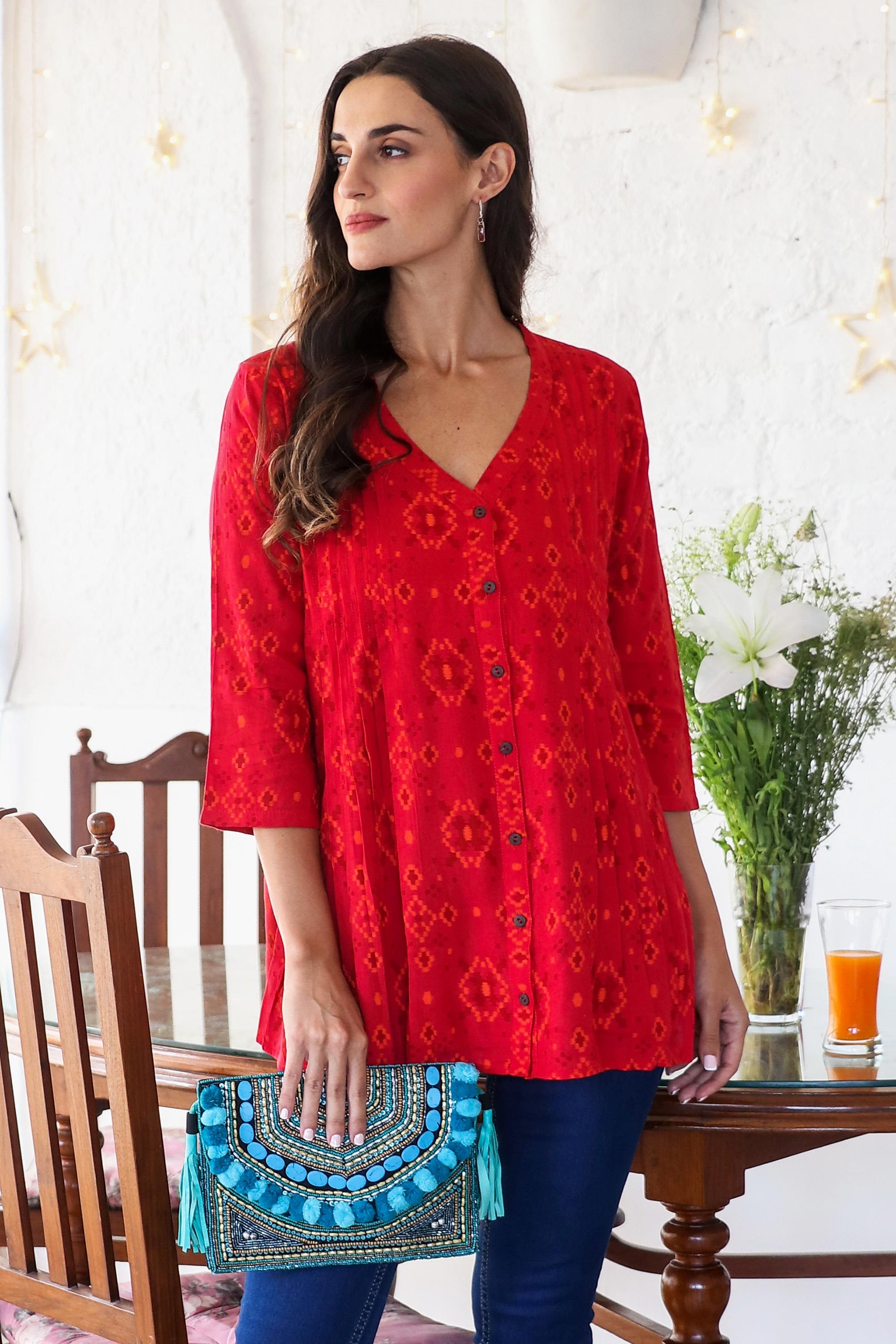 Celebrate India's rich culture wearing this brightly colored tunic designed by artisan Isha Jain. Hand crafted from soft, breathable viscose, the tunic features a screen printed star pattern created using a popular Indian dyeing technique called ikat. Front pintucked pleats, three-quarter sleeves, and a row of tiny buttons add thoughtful details to this vibrant look.