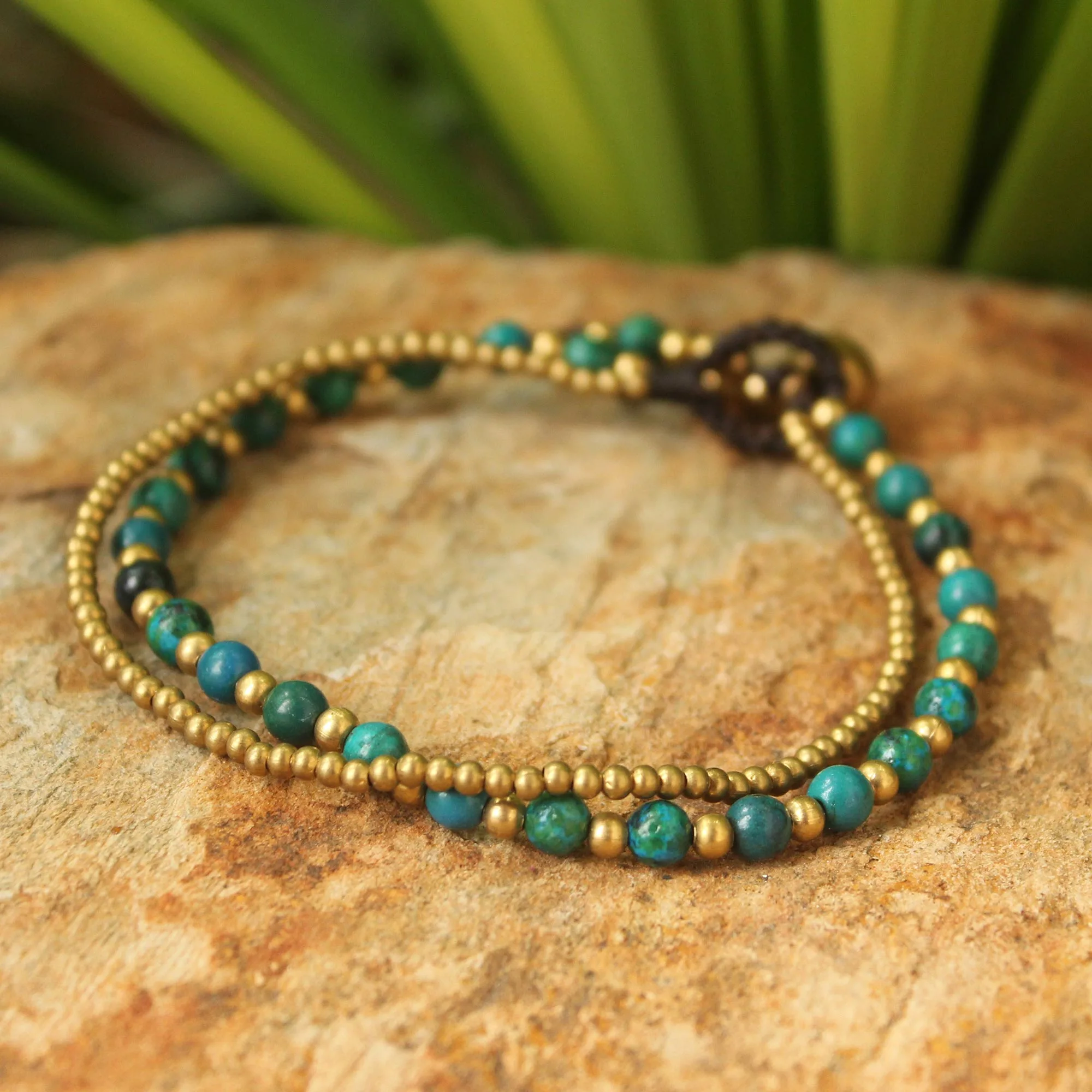 Warm brass and green serpentine beads come together in harmony. Crafted by Tiraphan Hasub from Thailand, this bracelet closes with a hollow brass bell. Its warm hues and marvelous design make it a regal, yet casual, bracelet for daytime wear.