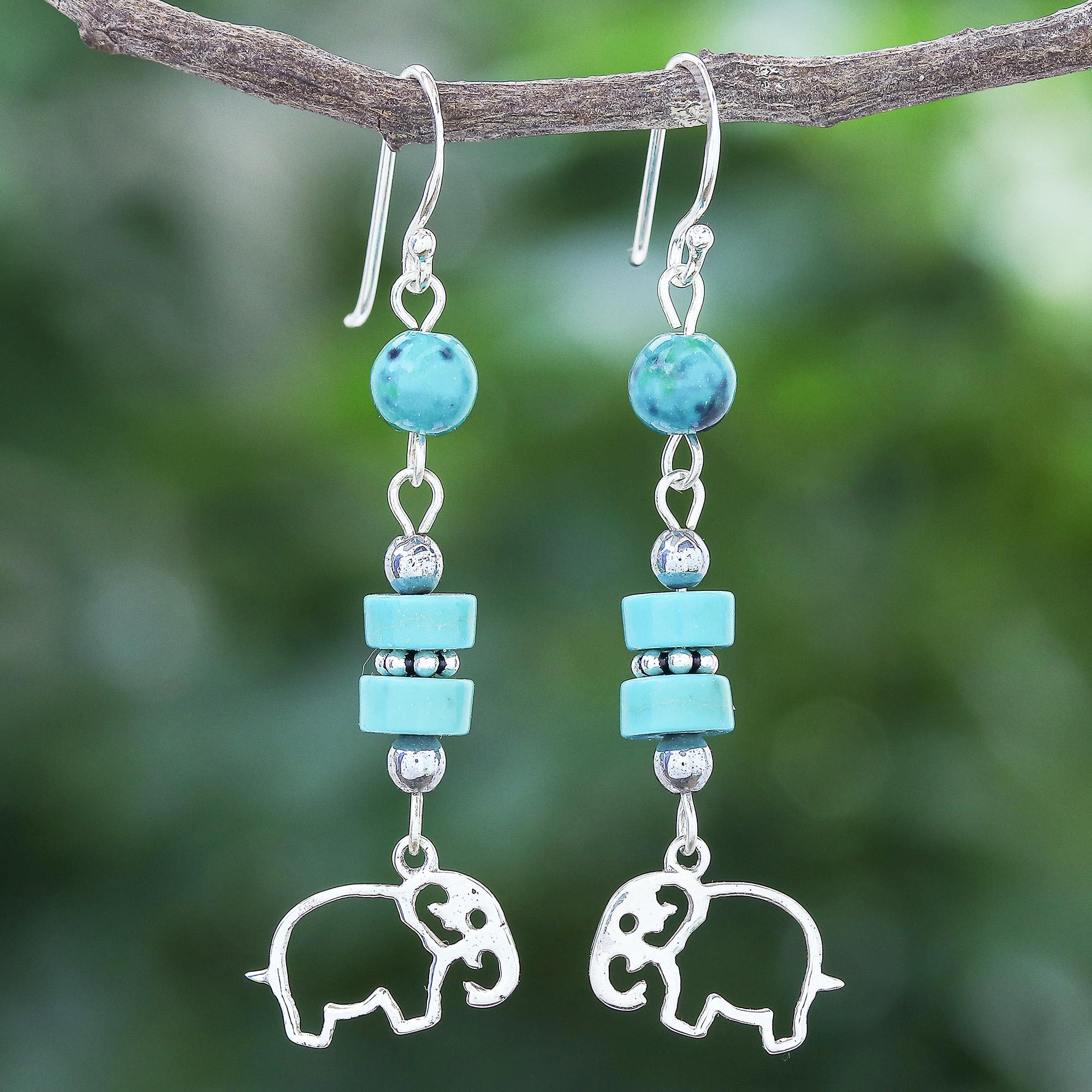 A elephant charm in sterling silver will make these dangle earrings designed by Thailand's Tipa your new favorite pair. The charms hang from reconstituted turquoise gemstones and green serpentine globes, while shining hematite beads make pretty accents. The artisan finishes the earrings with gleaming sterling silver hooks.