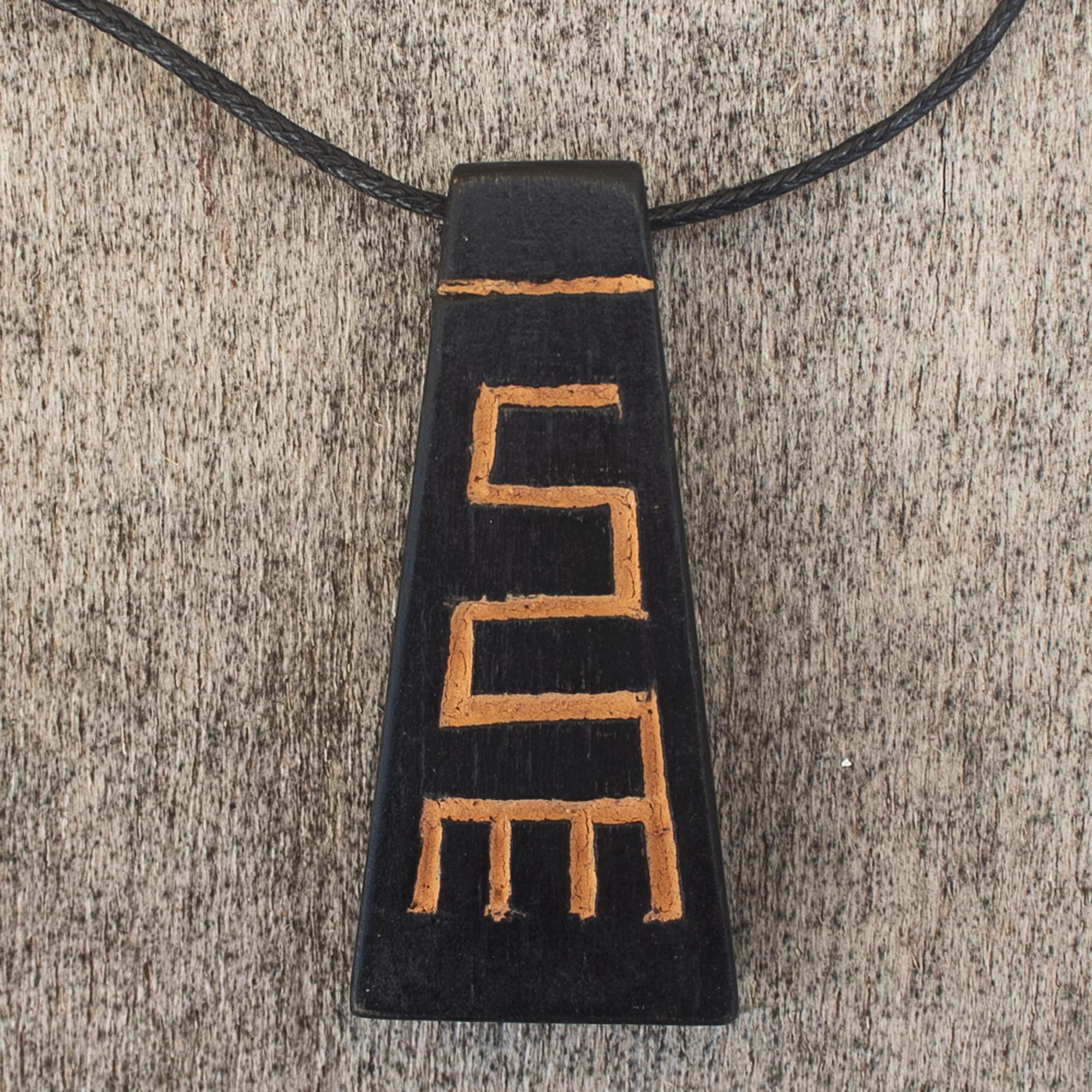 Drawing inspiration from various West African tribes, artisan Ralph Ashong presents this necklace infused with strength and power. Crafted by hand from local sese wood, the trapezoid-shaped pendant is engraved with an adinkra symbol called nkyinkyim, which is an Akan word representing "toughness" and "adaptability". Adinkra symbols are believed to have their origin an ancient kingdom that once stood where Ivory Coast is today in West Africa. The sleek pendant hangs from an adjustable nylon cord, making it a versatile accessory for men and women.