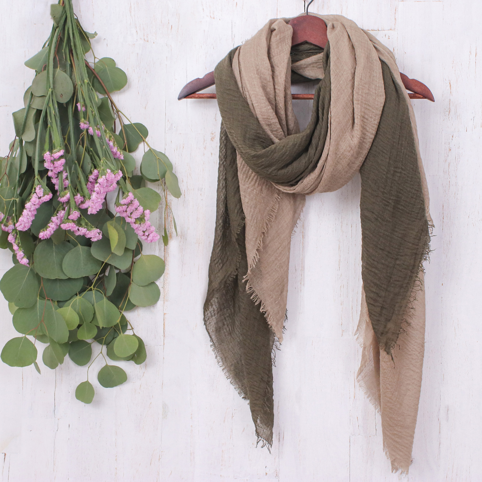 Set of 2 Lightweight Scarves in Olive and Mushroom, 'Classy Warmth'