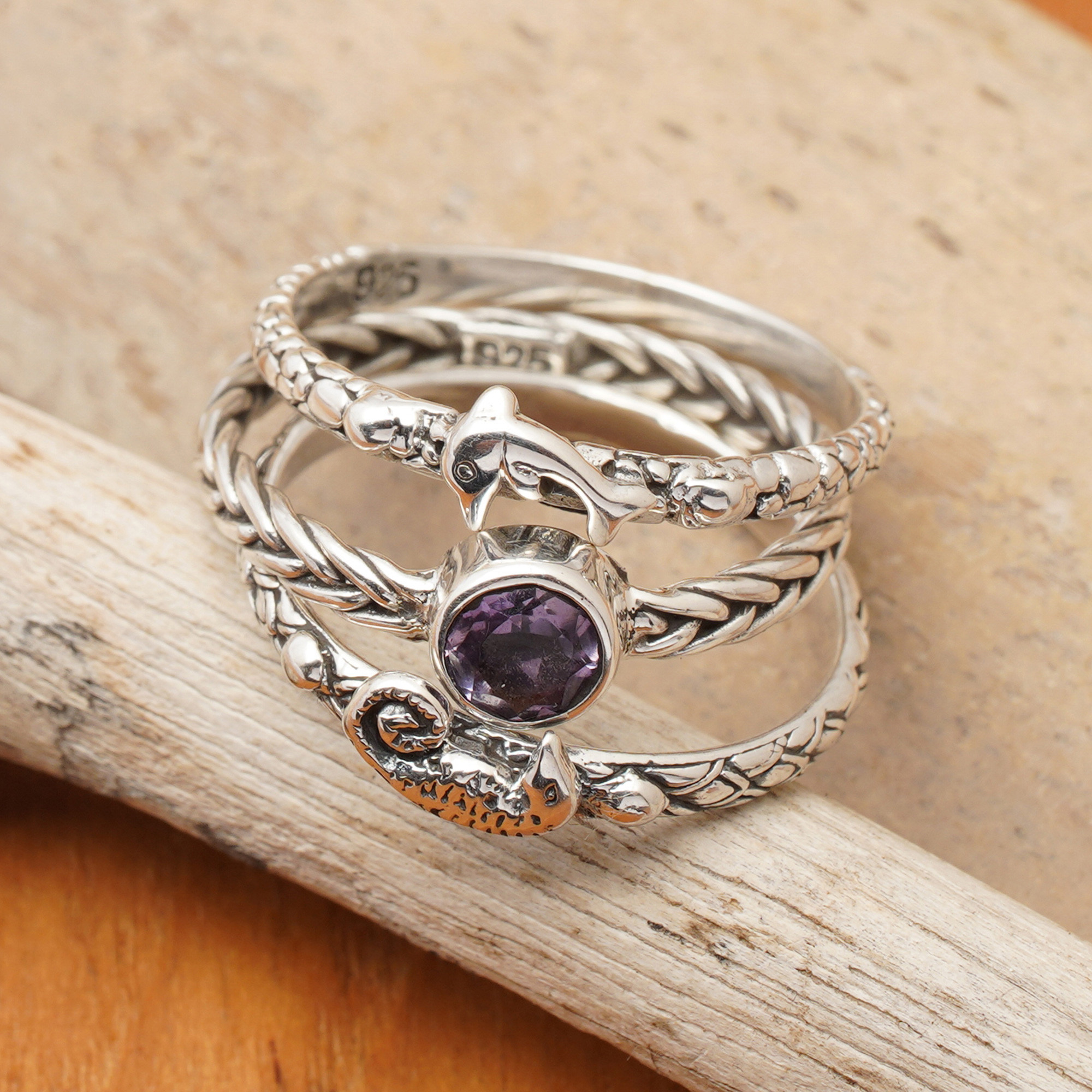 Mix and match accessories according to your outfit and mood with this set of three sterling silver rings from Bali's Dewi Putera. One is a single stone design showcasing a sparkling amethyst gem that catches the eye and a braided band that adds texture. The other two are band rings featuring an exquisite combination of lustrous and oxidized finishes and charming seahorse and dolphin motifs.