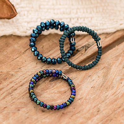 Set of 3 Crystal and Glass Beaded Rings in Teal and Blue, 'Dew Glints'