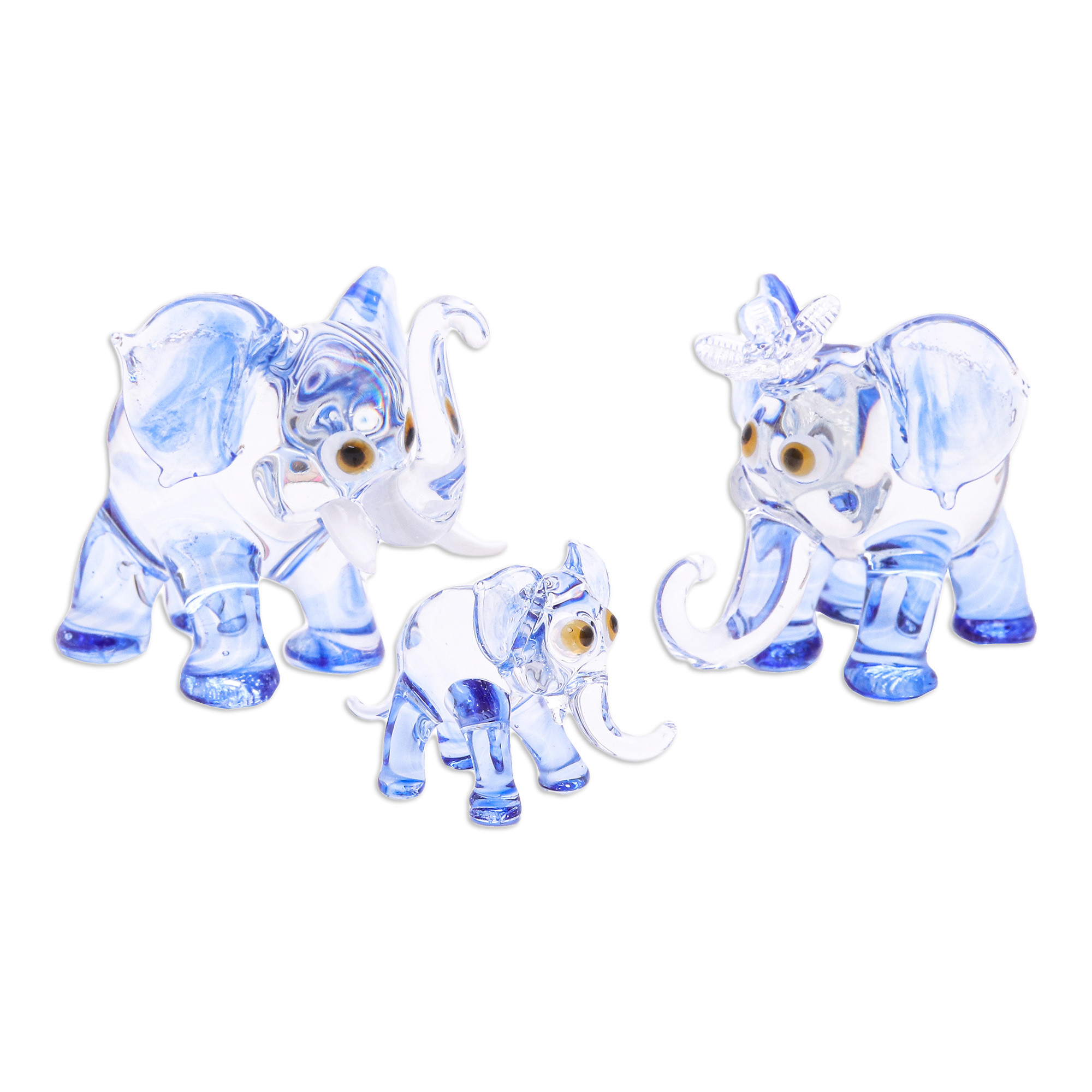 Honored in Thailand as national symbols, these adorable elephants pose for a traditional family scene crafted by Panapai. The artisan uses the ancient handblown technique to create each member of this giant lineage, adorning the three glass figurines with a blue hue representing magic and imagination.