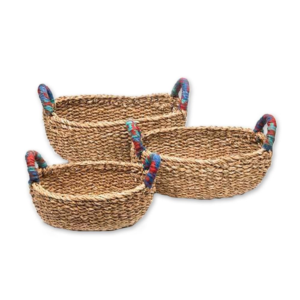 Organize your home with these fabulous Chindi-style baskets from India. This versatile set comes with small, medium, and large baskets, all of which are handcrafted from natural fiber with colorful upcycled fabric handles.