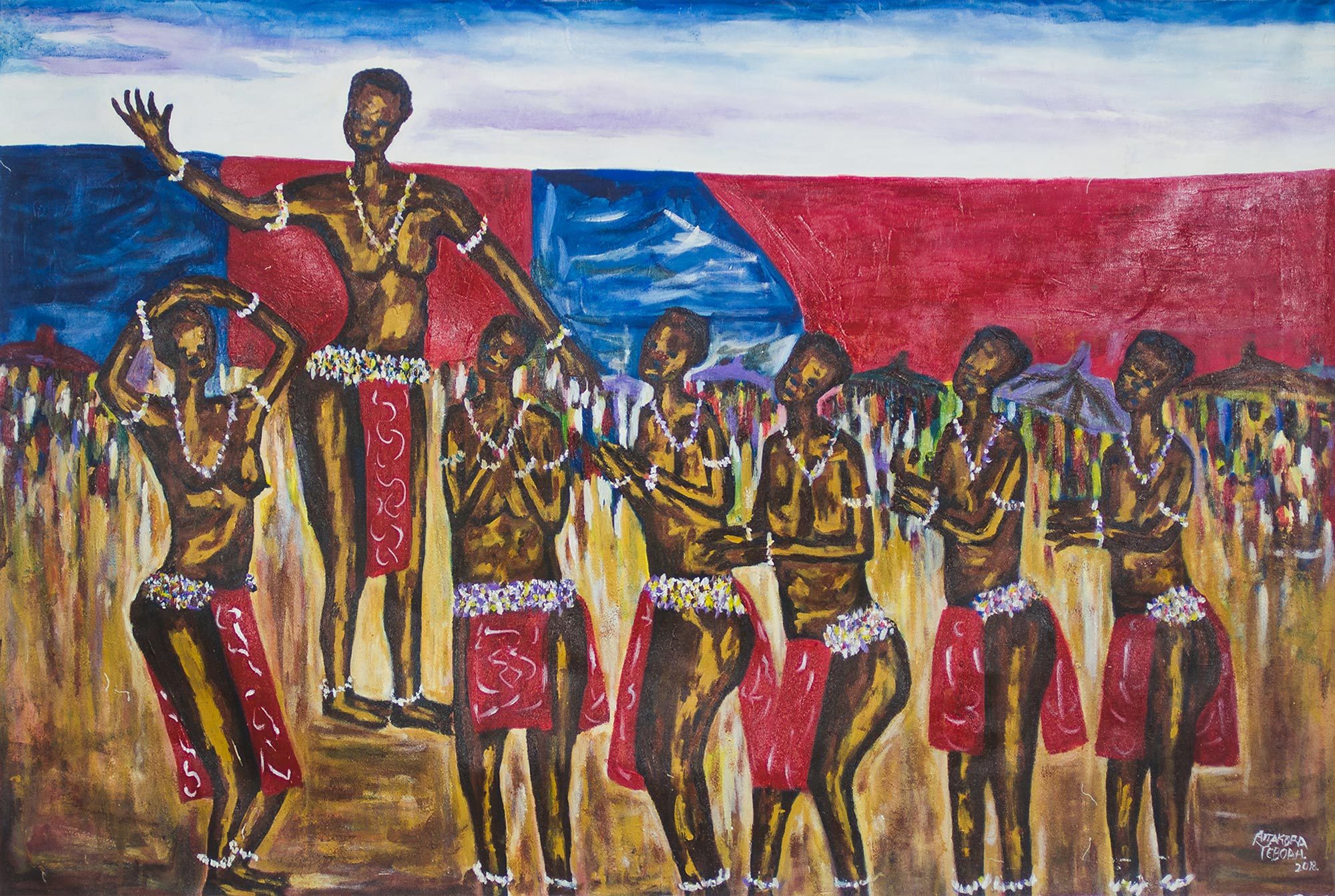 Performing the traditional Dipo dance, African tribespeople celebrate their culture in this painting by Ghanaian artist Attakora Yeboah. He paints this scene in an impressionist style, depicting a group of women who gather in front of a crowd to perform this dance. Says the artist, "Dipo is a traditional festival celebrated by the people of Odumase in the Eastern region of Ghana. The festival is celebrated in the month of April every year. The festival is used to usher into puberty girls who are virgins, and it signifies that a lady who partakes in it is of age to be married."