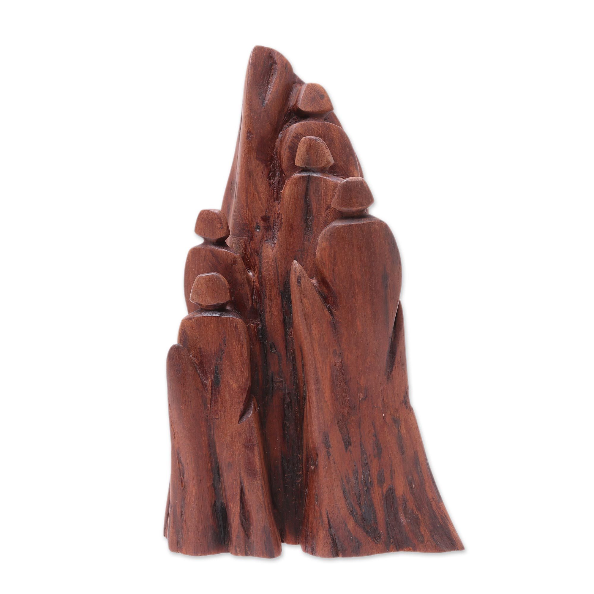Embarking on a mountain climb, five friends are hand-carved of khair driftwood in this sculpture by Suresh Pant. The Indian artisan takes regular walks by the river near his home, collecting driftwood. With this piece, he finishes the art that nature started, working with sustainable wood.