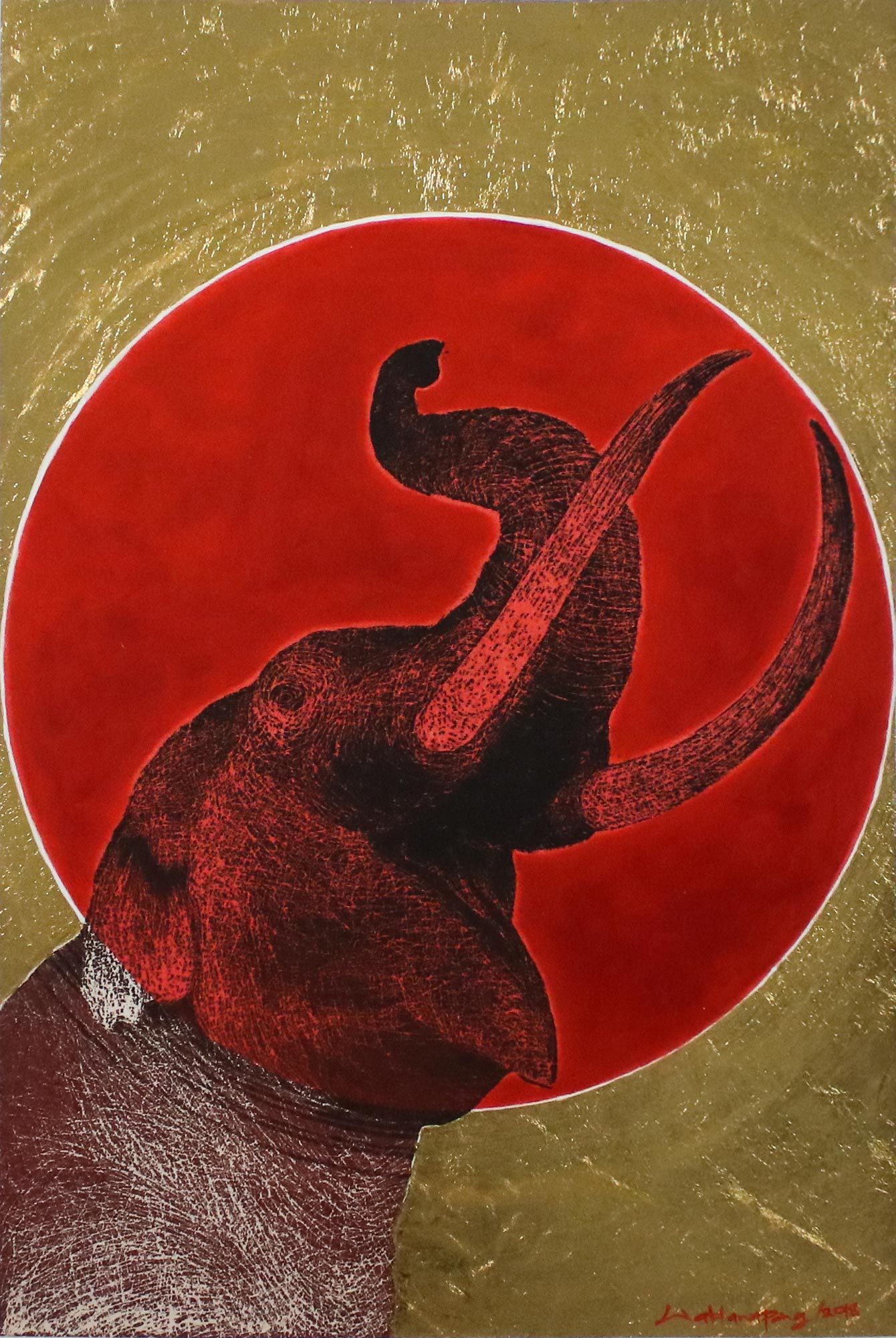 This painting is part of Thai artisan Det's concept "Elephant beauty from my mind." Against a stark red sun in a vertical composition, an elephant in black and white with realistic details raises its trunk towards the sky. Det reflects on how the sun strikes happiness in humans and elephants alike, surrounding the red sun with gleaming gold foil.