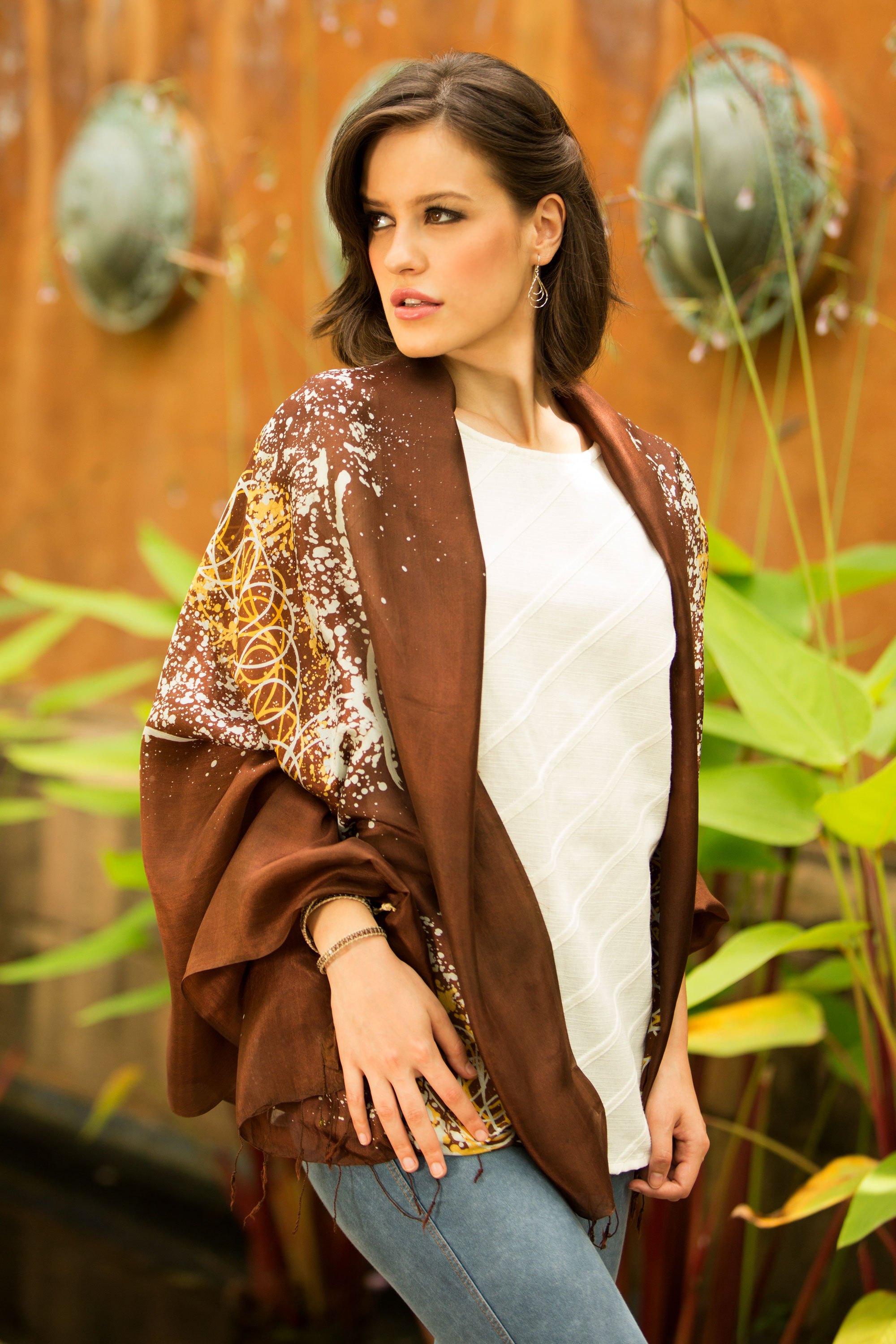 Drawn by hand on luxurious silk, yellow and white lights explode in a pattern of dazzling fireworks. Vinita creates this beautifully modern shawl with batik motifs on a rich brown background.
