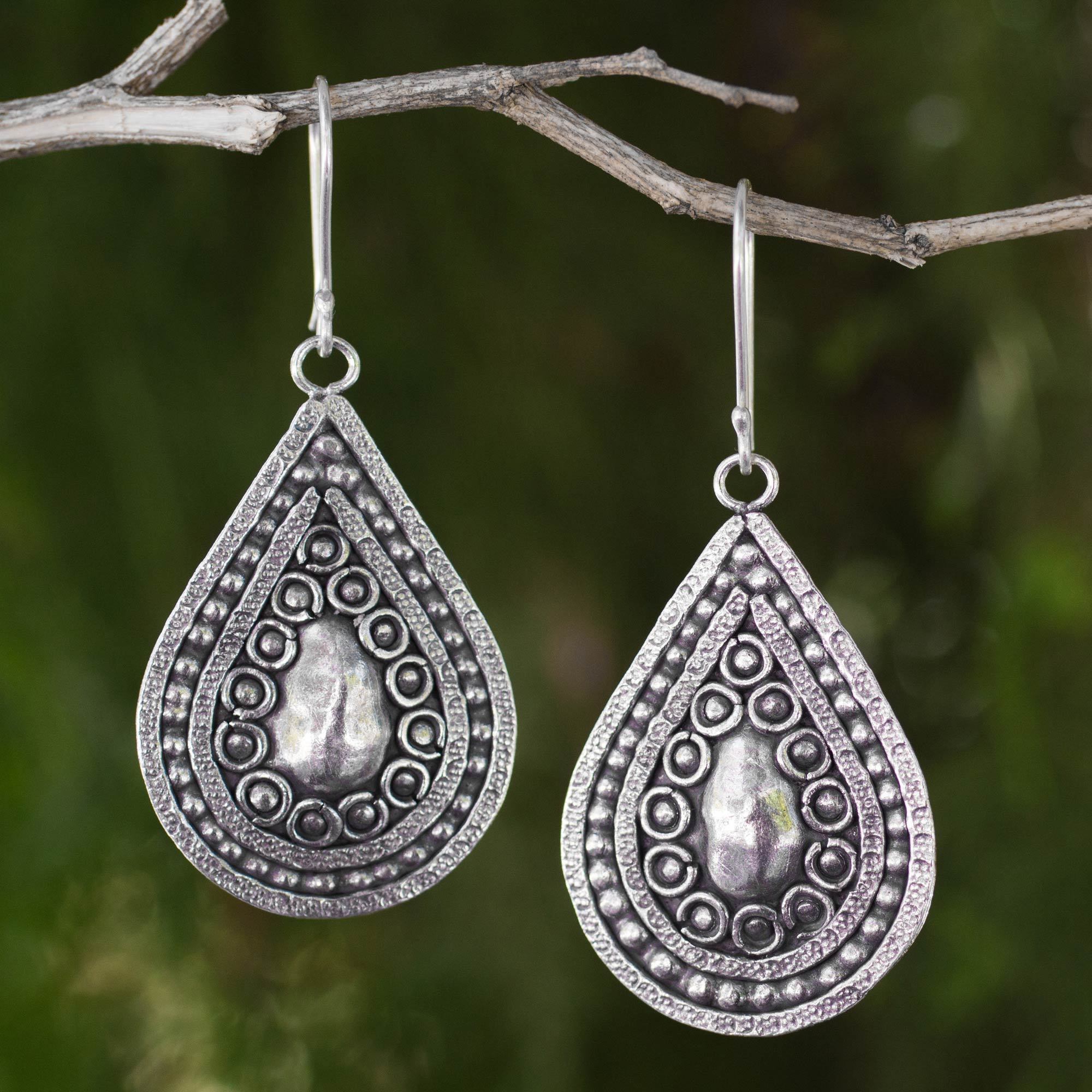 Silver 950 Thai Hill Tribe Style Dangle Earrings, 'Thai Dew'