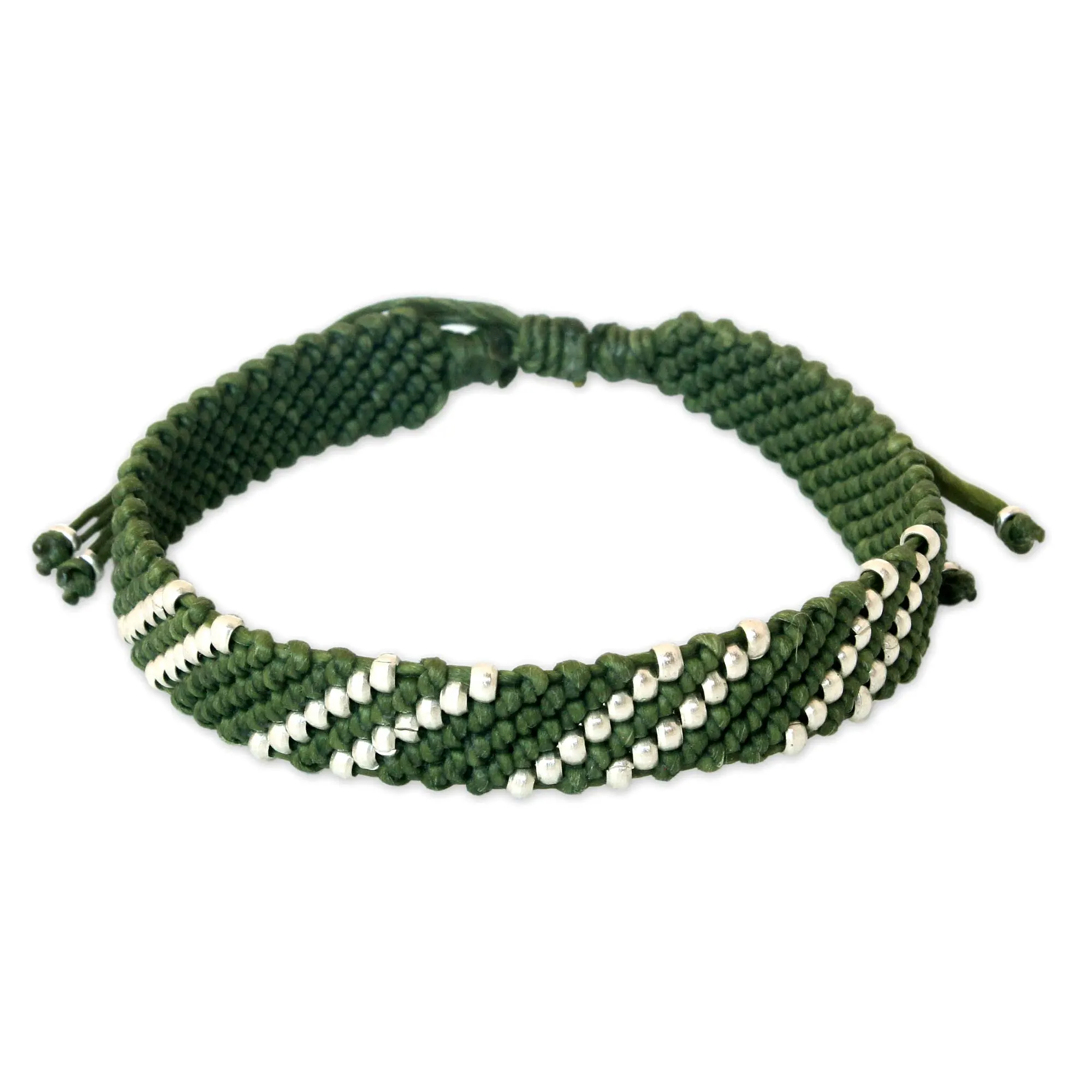 Knotted by hand on green cords, shining silver beads form diagonal rows. Napapat showcases the silver art of Thailand's Karen hill tribe. This beautiful macrame bracelet slips over the wrist, and the length can be adjusted by sliding the knot along the cords.