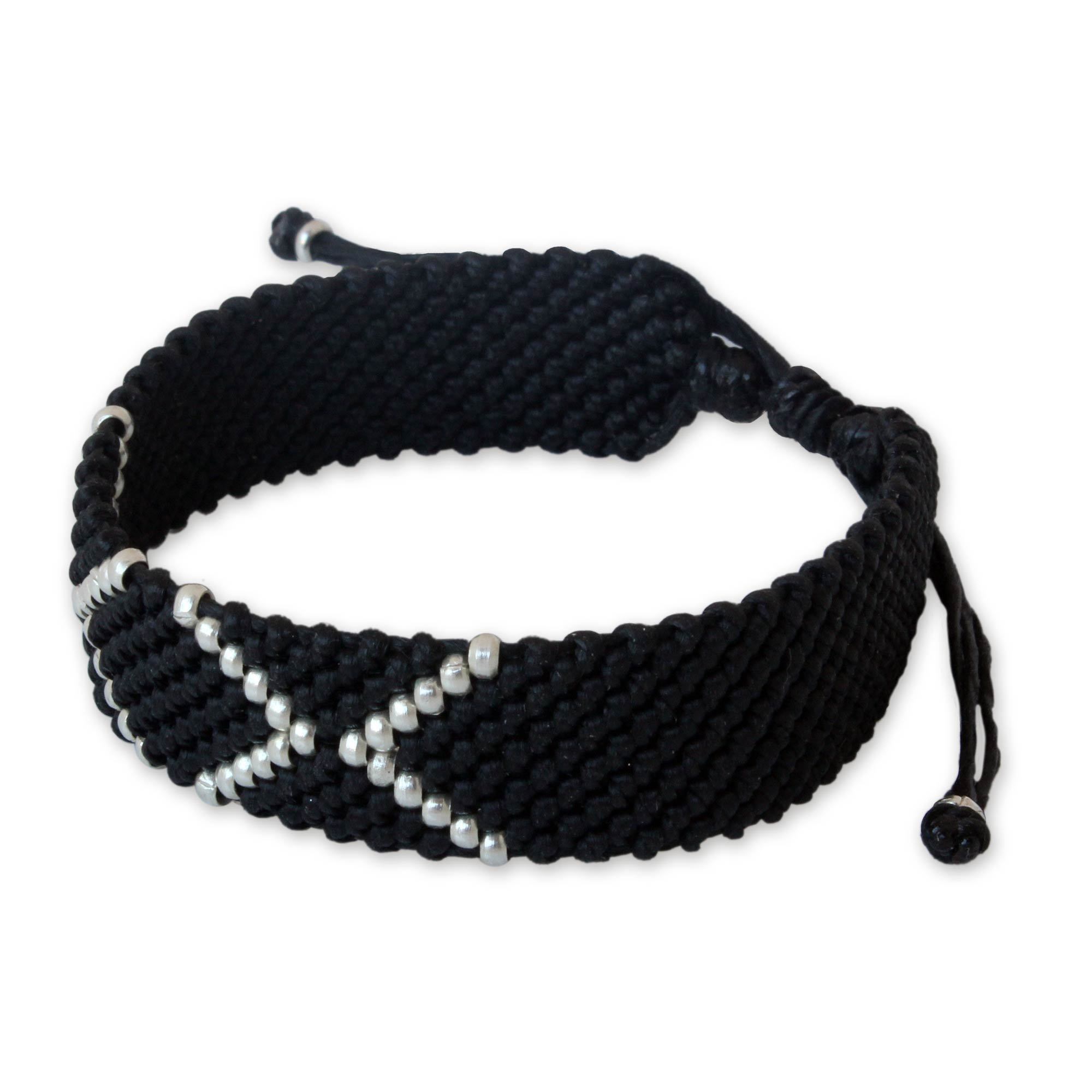 Knotted by hand on black cords, shining beads form delightful diamonds. Napapat showcases the silver art of Thailand's Karen hill tribe. This beautiful macrame bracelet slips over the wrist, and the length can be adjusted by sliding the knot along the cords.