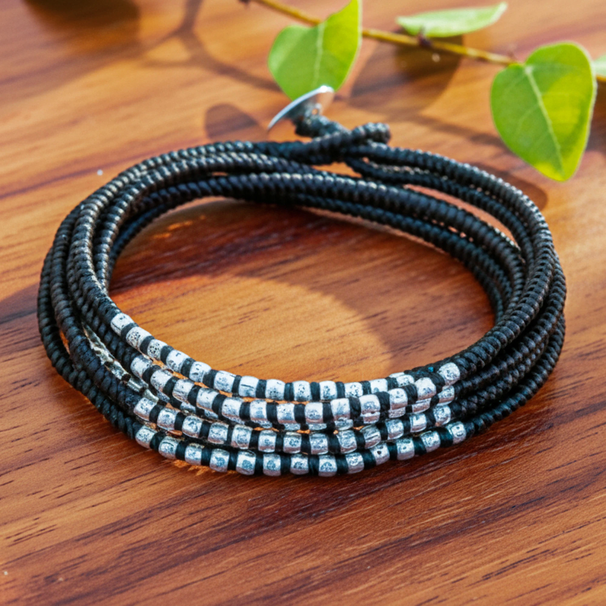 Thailand's Napapat designs a trendy wrap bracelet in chocolate brown. She unites three strands into the loop and clasp, knotting them by hand into strands long enough to wrap around the wrist. Florid beads of sterling silver plated brass contrast with feminine elegance. They are crafted by Karen hill tribe artisans.