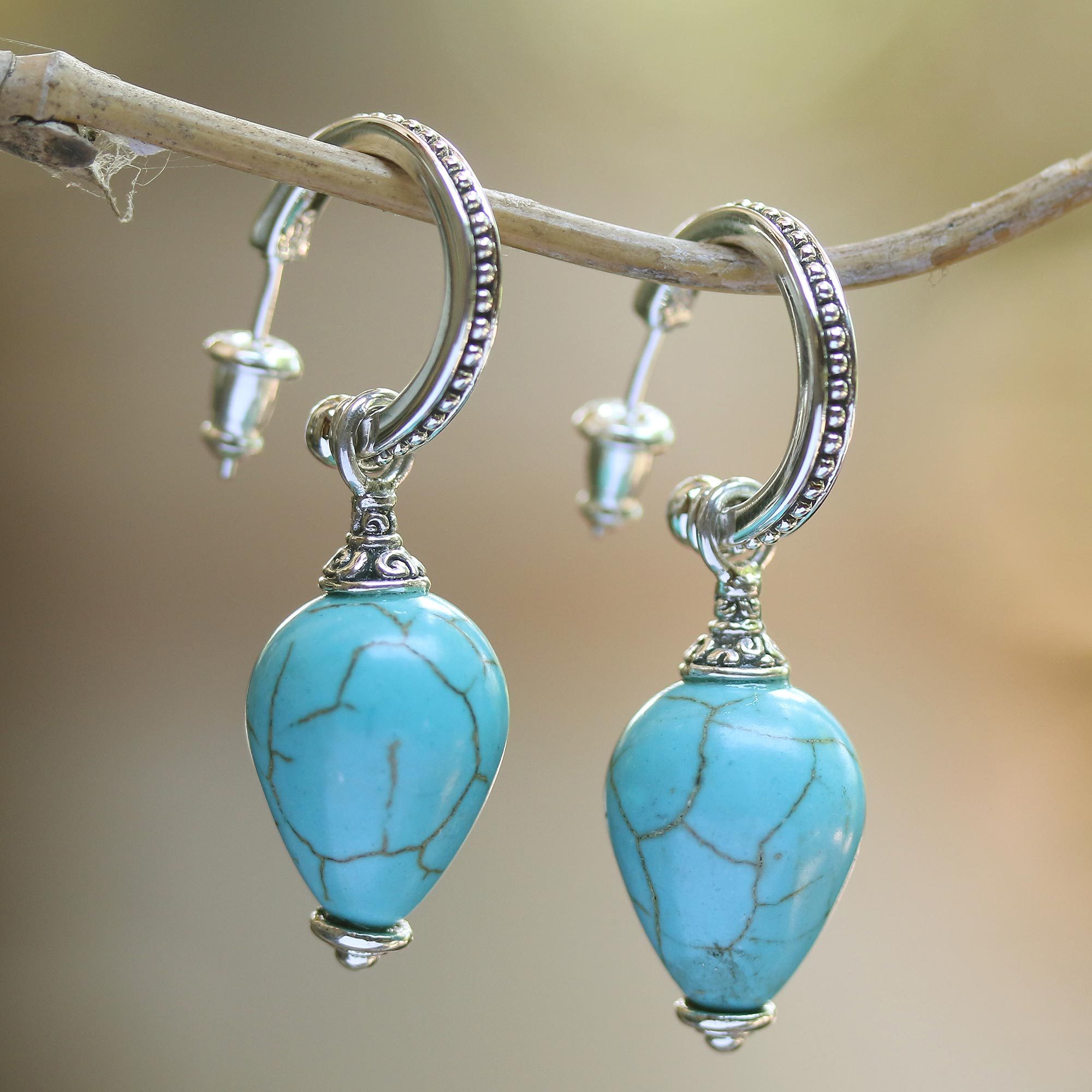Silver and Blue Reconstituted Turquoise Earrings from Bali, 'Bogor Lanterns'