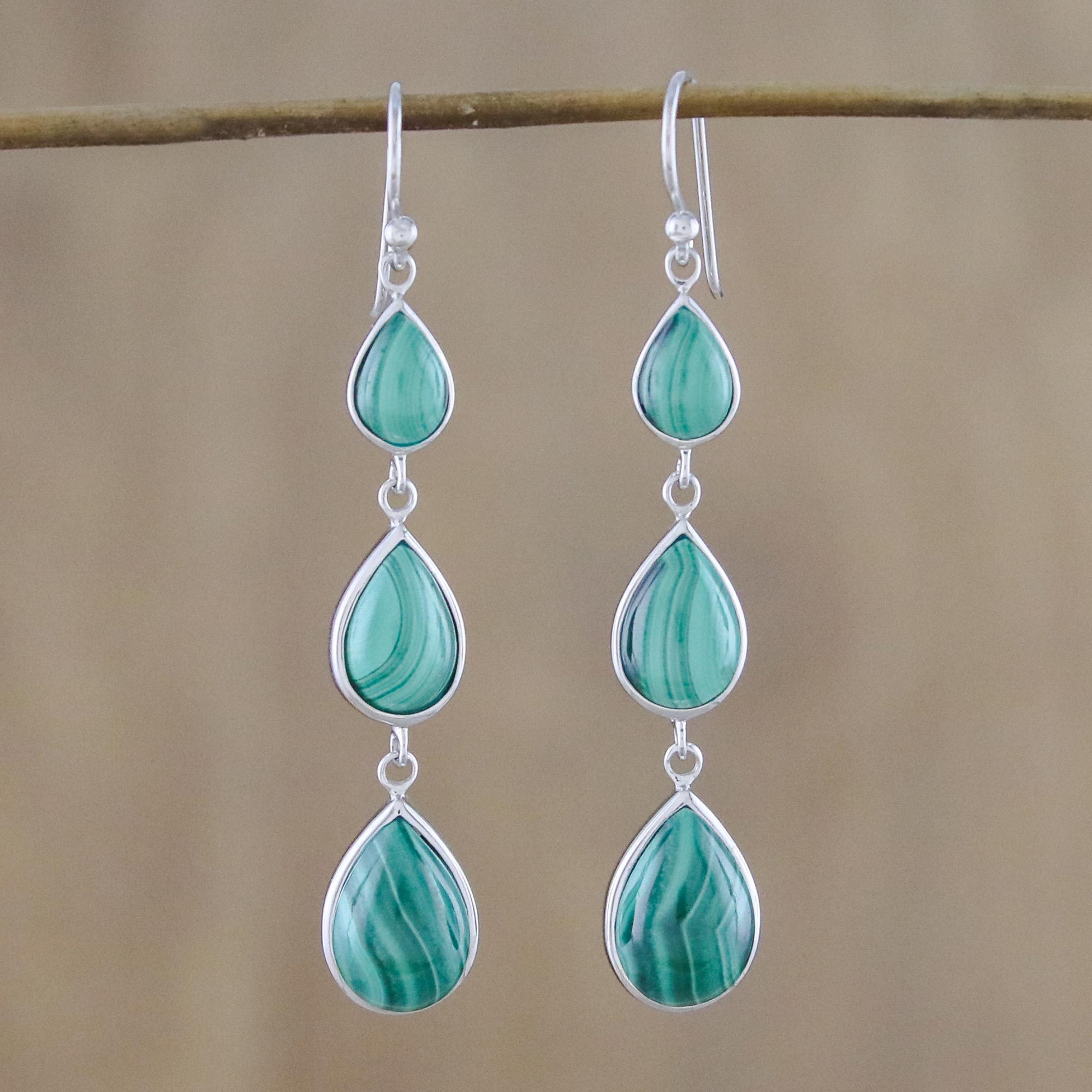 Silver and Malachite Dangle Earrings from Thailand, 'Salt Water Drops'