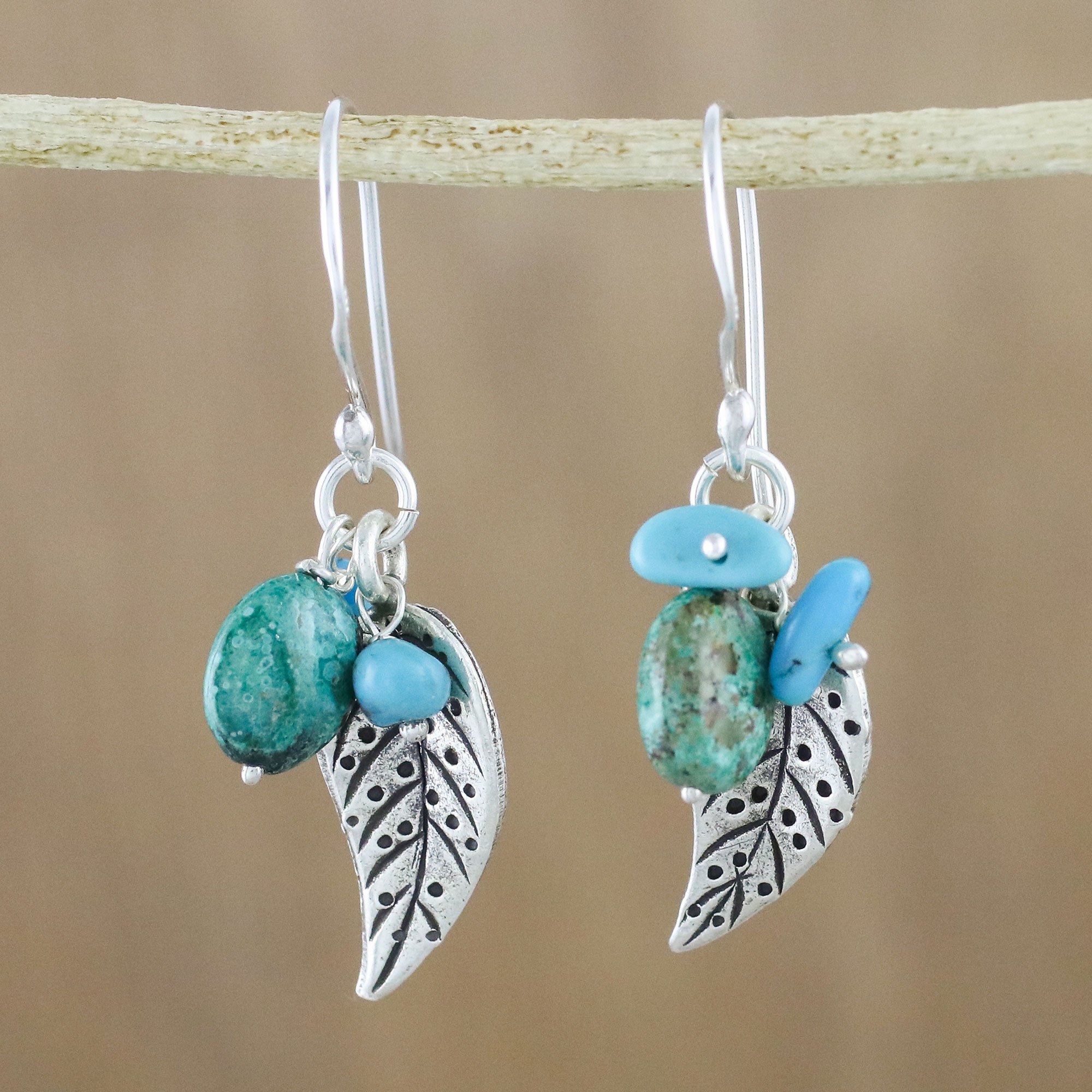 Lively leaves are crafted of 950 silver by Karen hill tribe artisans, dangling from the ears with a truly fashionable look. Accentuated with blue-green pieces of reconstituted turquoise, these fascinating earrings are presented by Thailand's Withaya Cheunjit. They adorn the wearer on hooks of sterling silver.