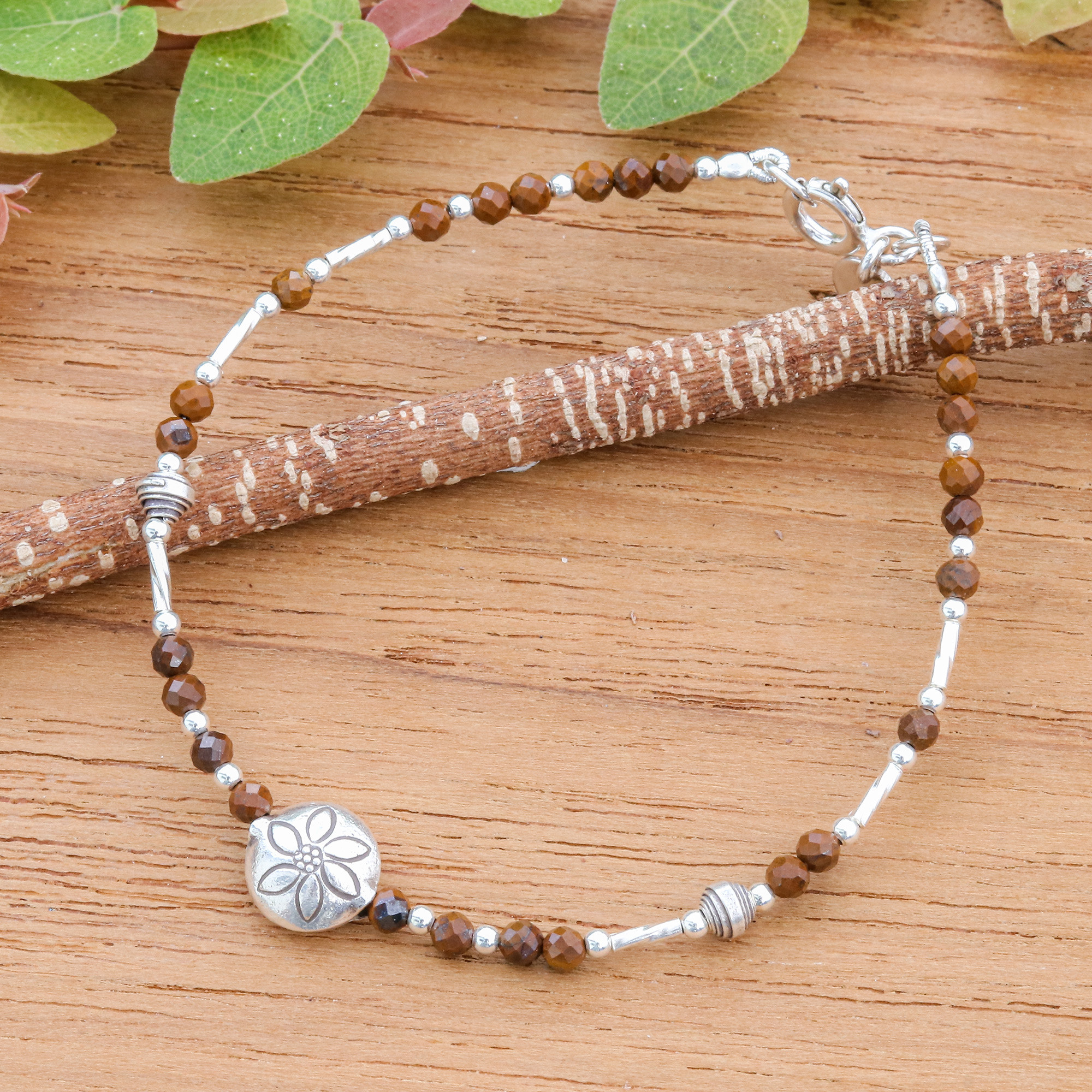 Petals from the Hill Tribes let their dapper details be charmed by a warm hue of courage in design by Thailand's Siranya. This bracelet complements its floral pendant with silver and tiger's eye beads, each arranged to recreate the essence of the region's spirit.