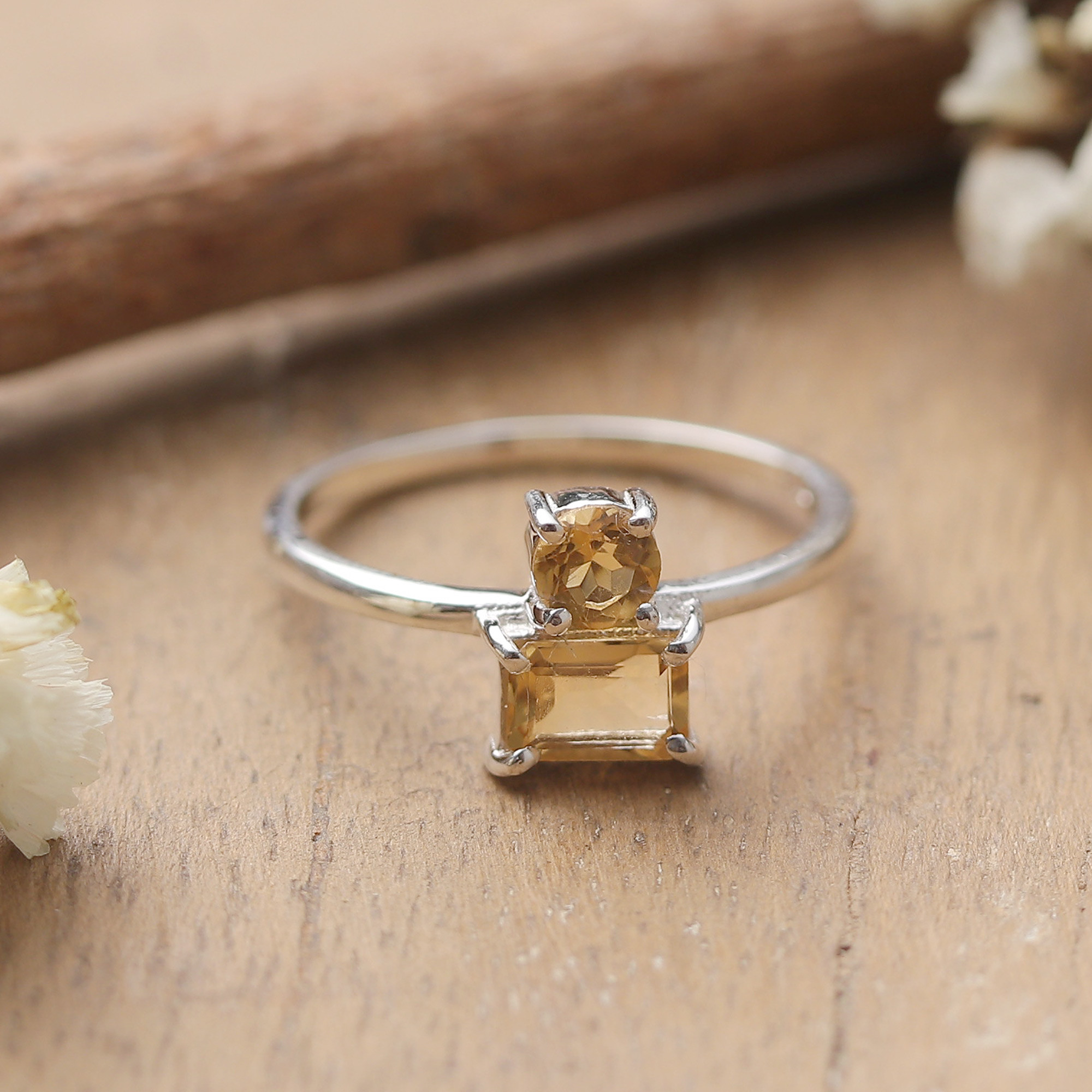 Silver Cocktail Ring with Round and Rectangular Citrine Gems, 'Double Delight'