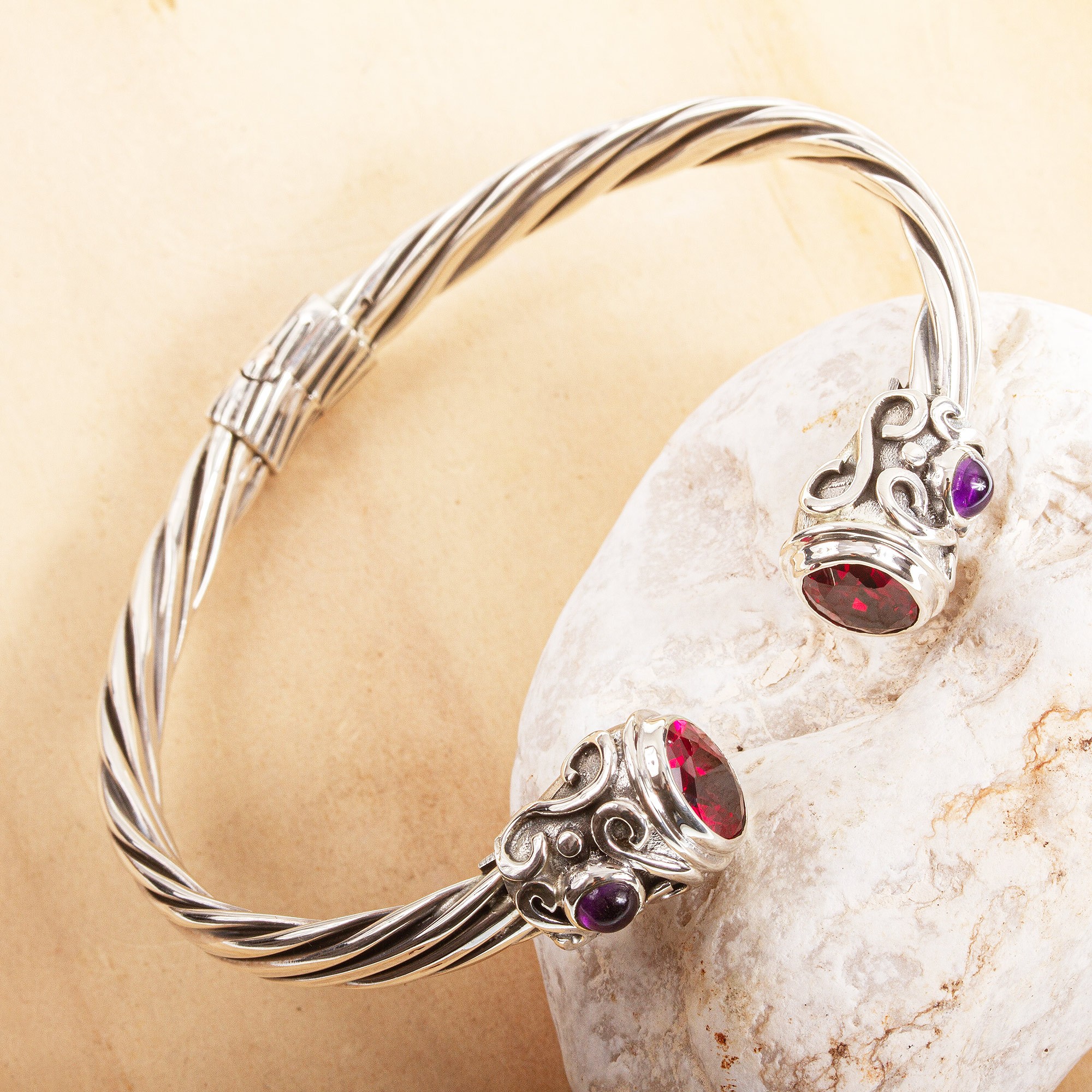 Silver Cuff Bracelet with Garnet and Amethyst, 'Light from Within'