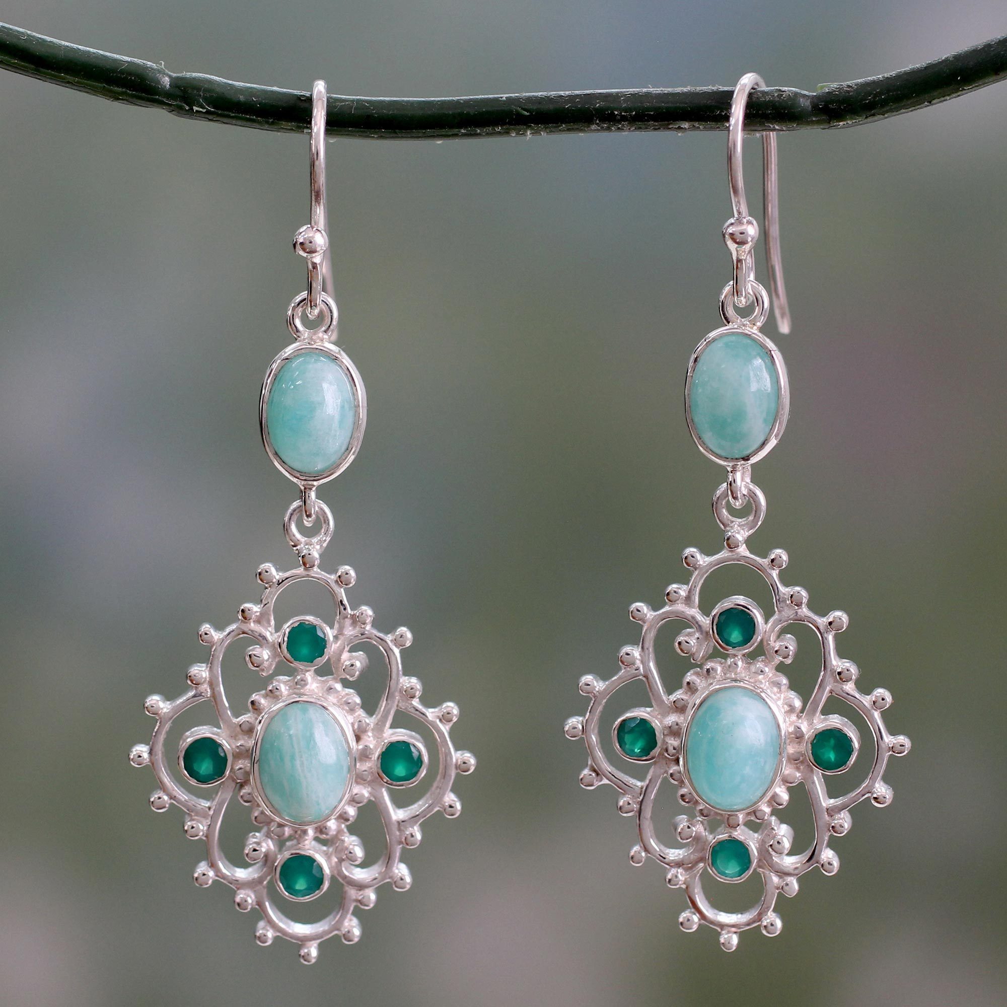 An elegant trellis-like design showcases green and blue stones like garden leaves in these earrings from Shubra Singh. The artisan crafts the earrings from polished sterling silver, adding cabochons of cool amazonite and petite round faceted green onyx.