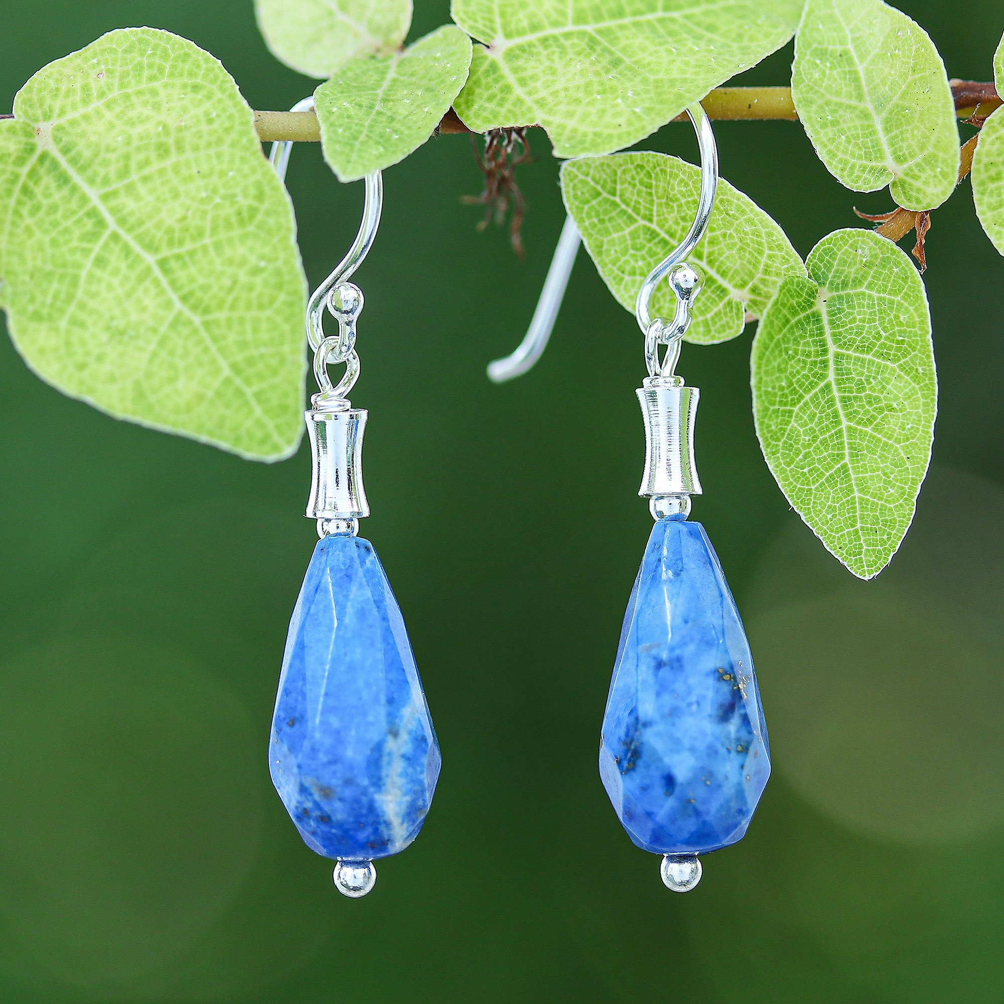 Like droplets of midnight sky, these sterling silver earrings showcase drop-shaped lapis lazuli stones that command attention with their deep blue intensity. The clean, contemporary lines and sophisticated design by Thailand's Sareeyakarn transform these accessories into bold statement pieces that effortlessly bridge the gap between casual charm and evening elegance.