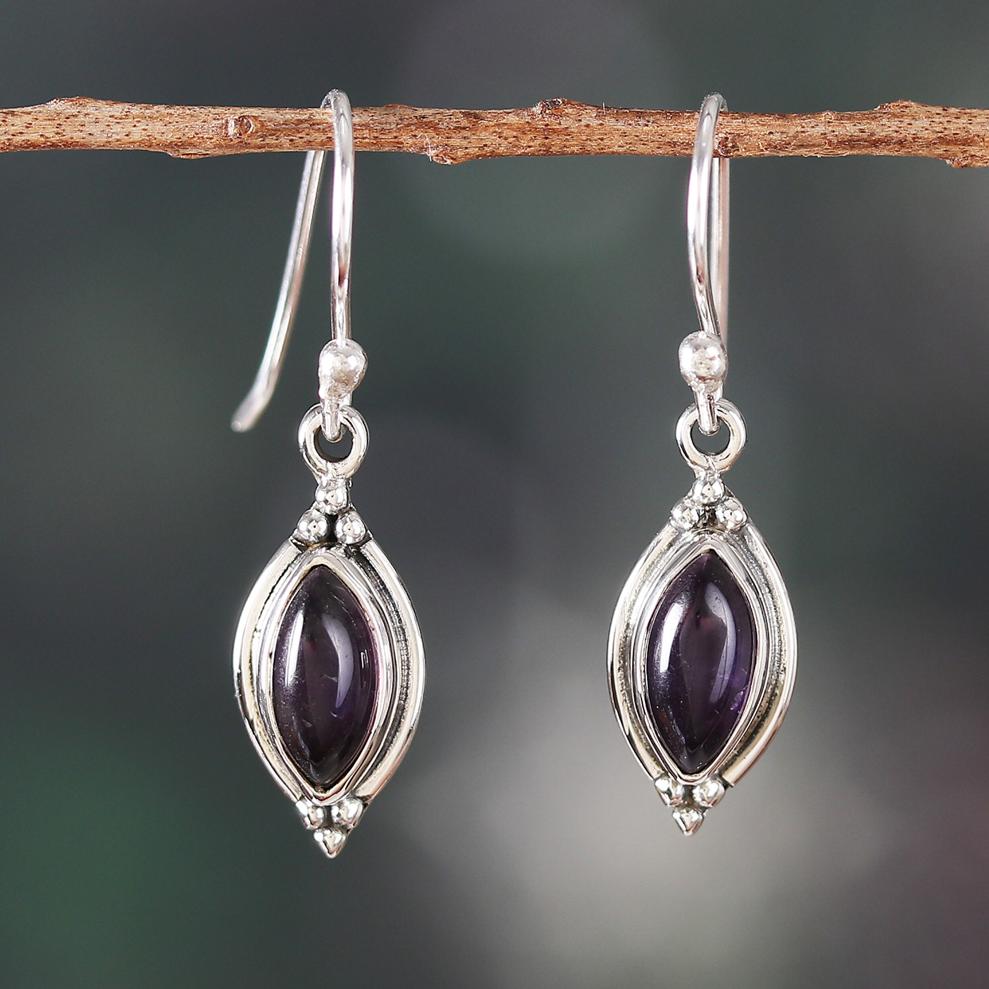 Silver Dangle Earrings with Marquise-Shaped Amethyst Stones, 'Purple Flare'