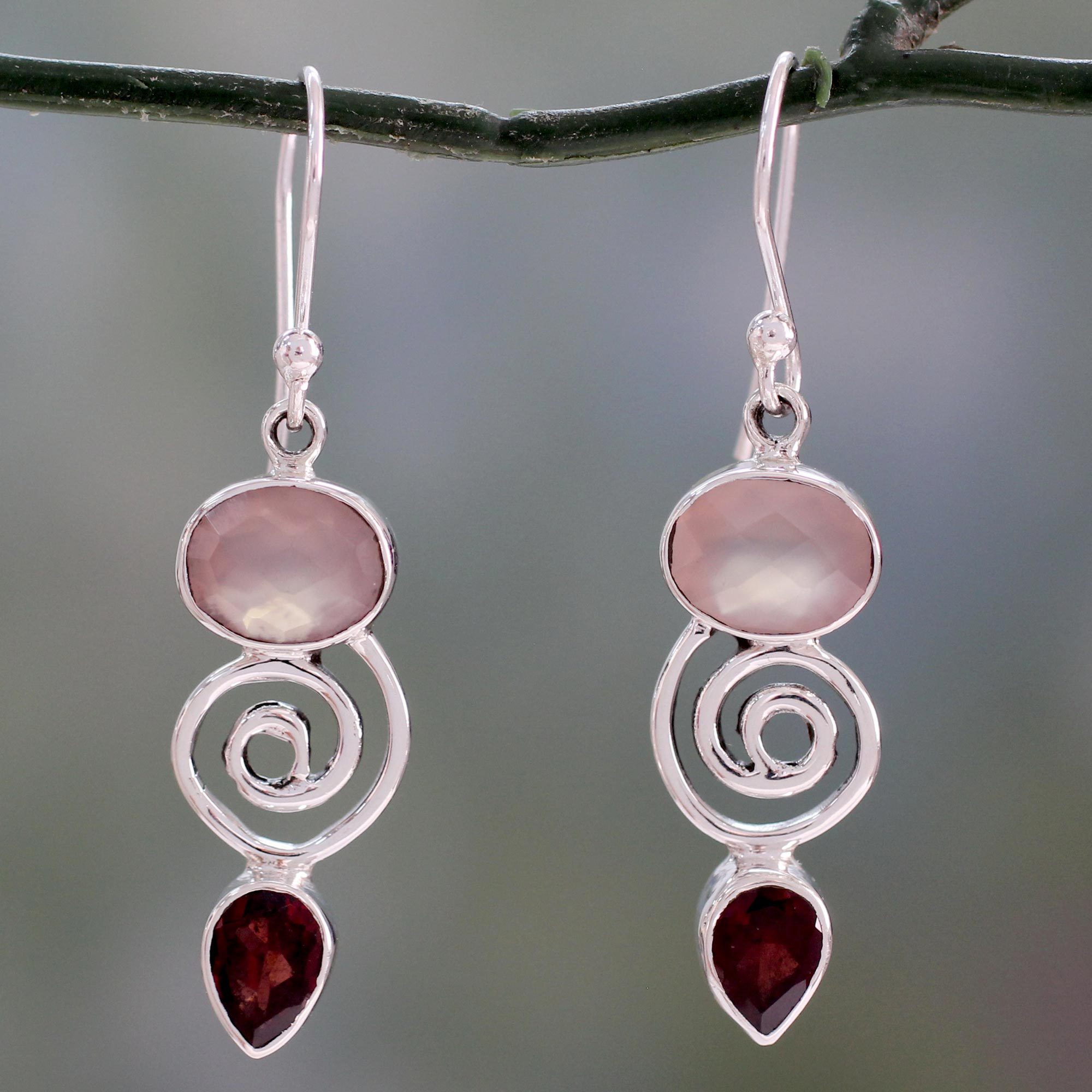 Sweetly pink and luminous rose quartz takes you on a romantic journey that ends with crimson garnets. The road takes the scenic route in the form of a silver spiral, but you arrive looking dandy. Neeru Goel in India crafts the dangle earrings with natural gems set in polished sterling silver. The checkerboard-cut oval rose quartz and the pear-shaped garnets total over 7 carats.