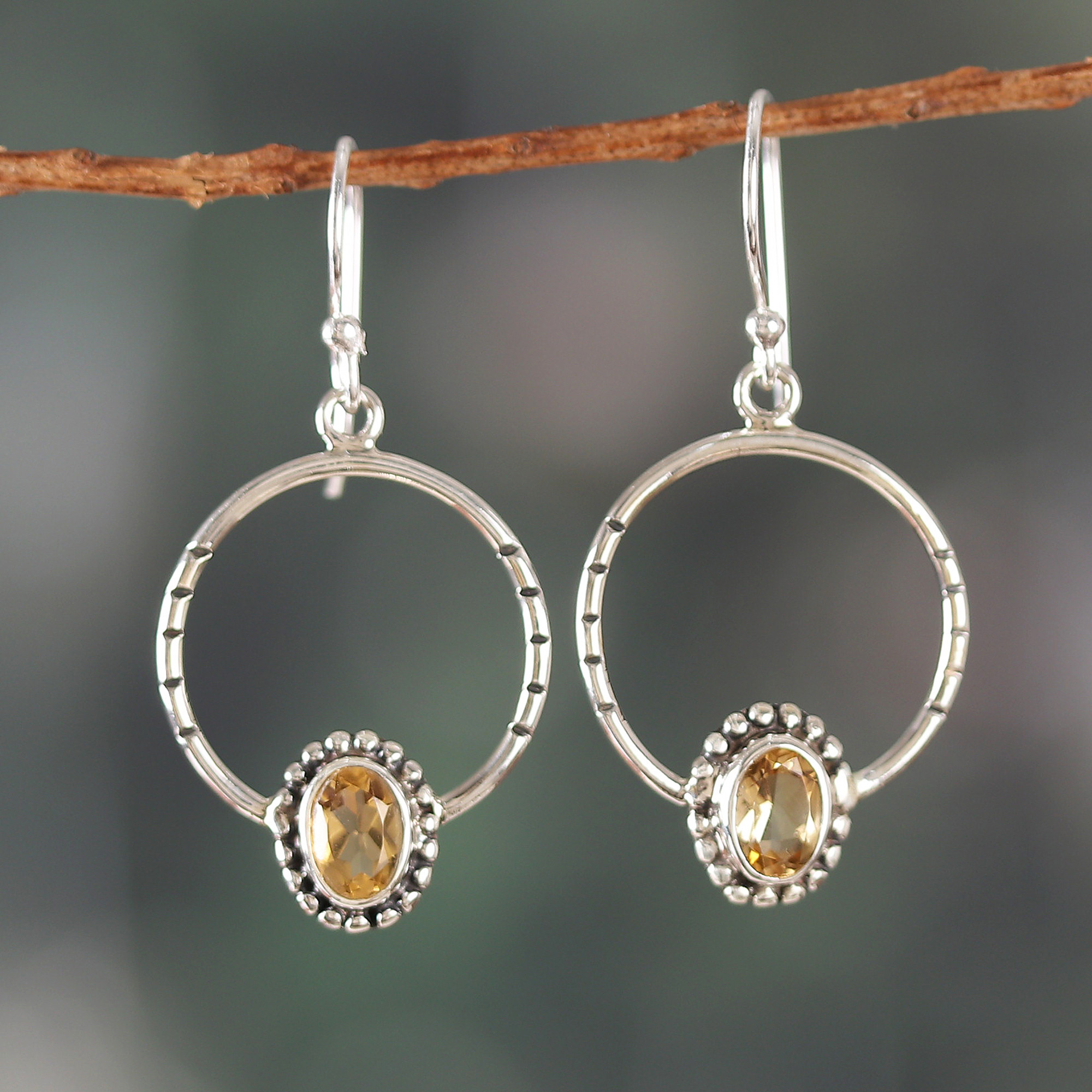 Silver Dangle Earrings with Two-Carat Oval Citrine Gemstones, 'Cycles of Radiance'