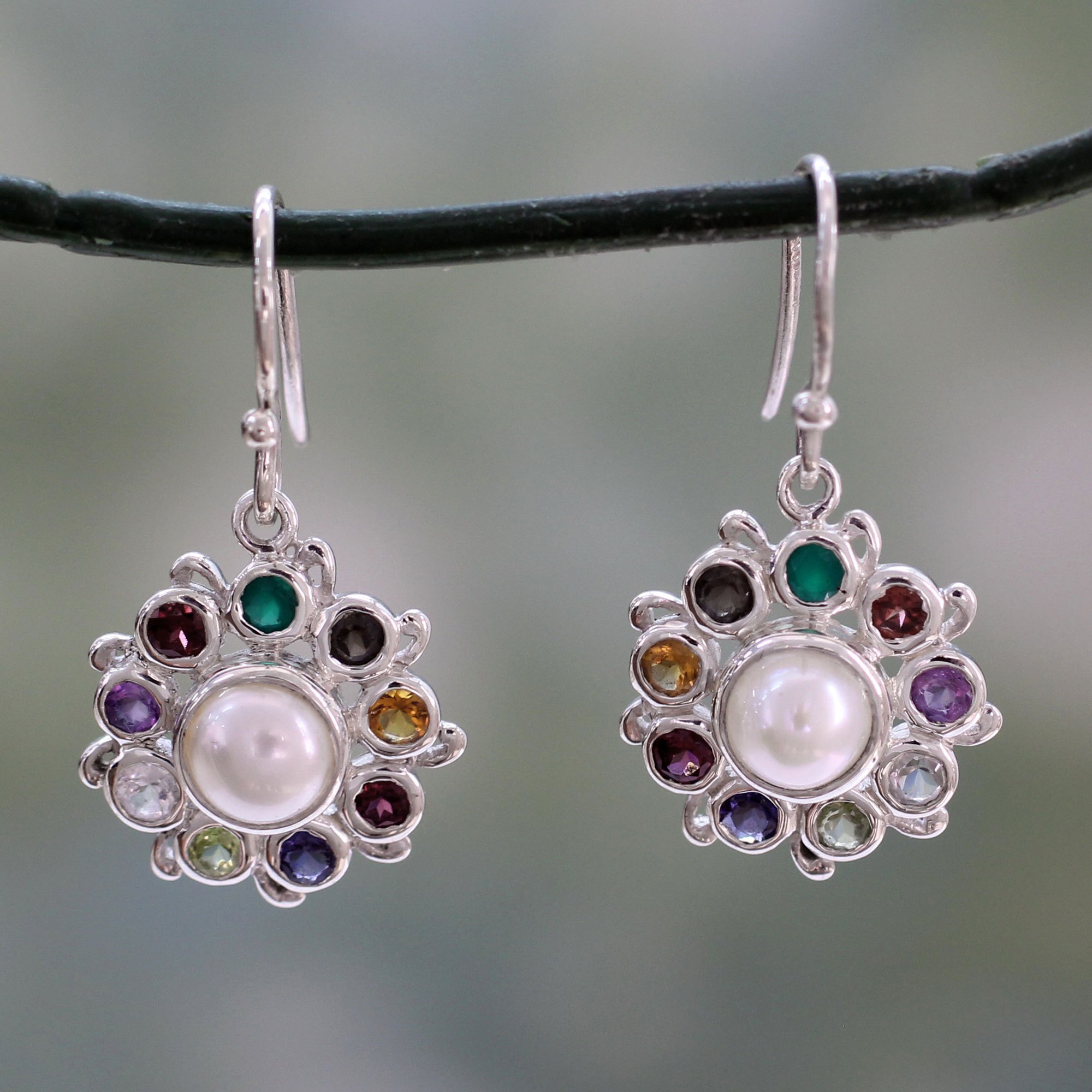 Sterling silver tendrils surround creamy cultured pearls like halos. Set with colorful faceted gemstones, the design brings rainbow colors to feminine earrings. Shubhra Singh selects a bright medley of garnet, smoky quartz, onyx, and white topaz that mingle with peridot, iolite, amethyst and citrine in these exquisite handcrafted earrings.