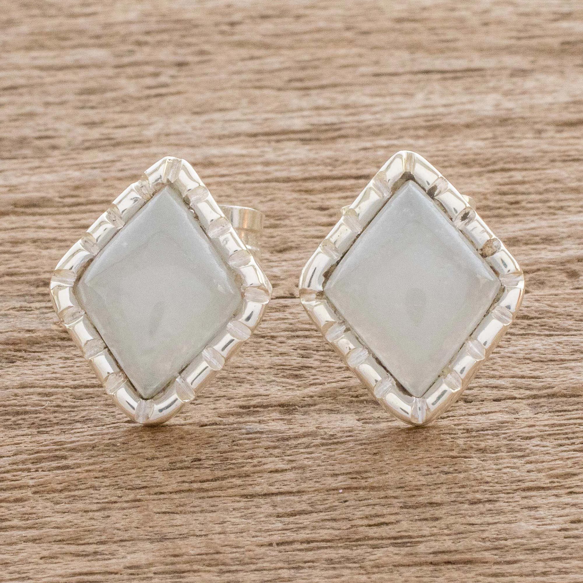 Silver Stud Earrings with Pale Ice Green Jade Diamonds, 'Ice Green Diamond'