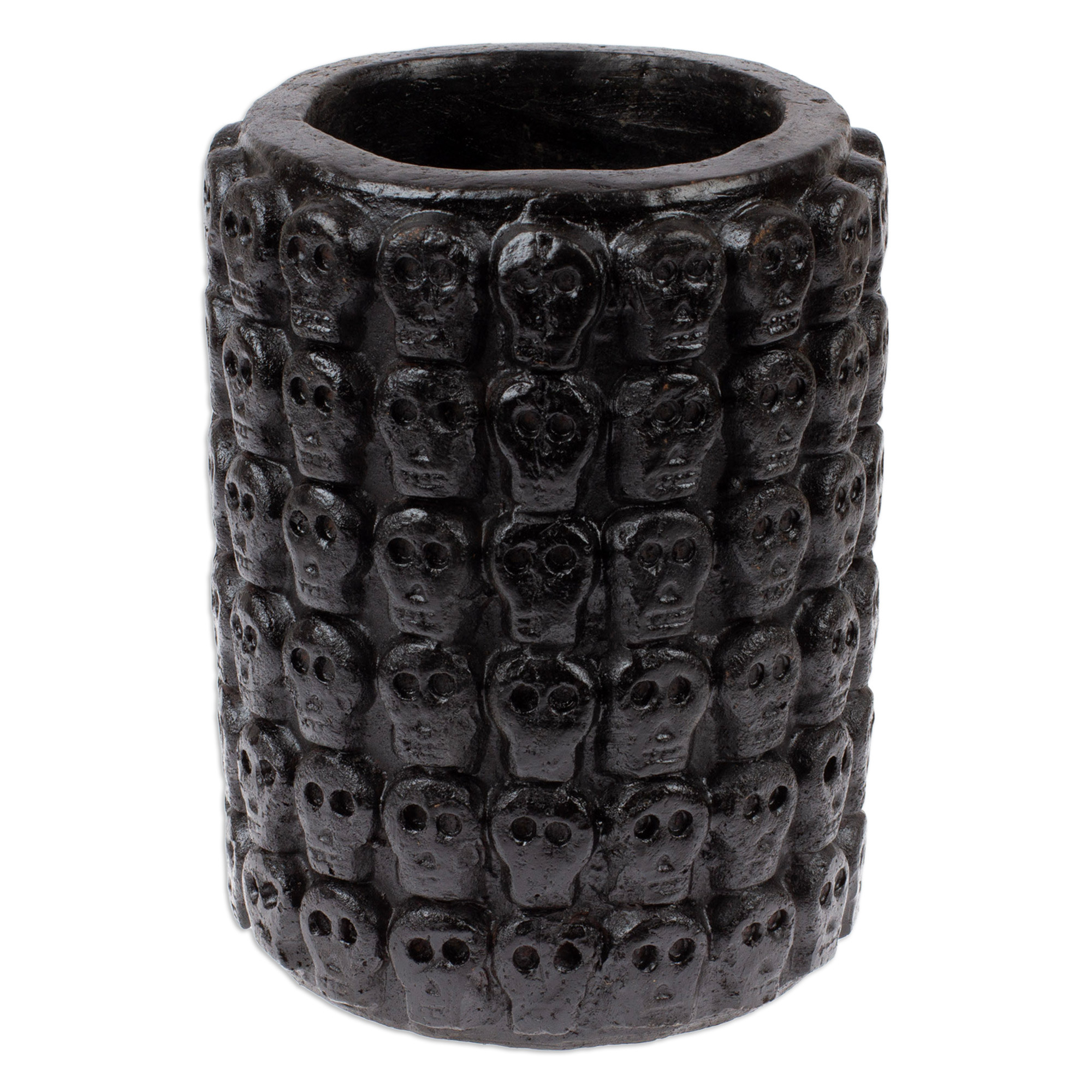 Skull-Patterned Black Ceramic Flower Pot from Mexico, 'Rows of Dark Skulls'
