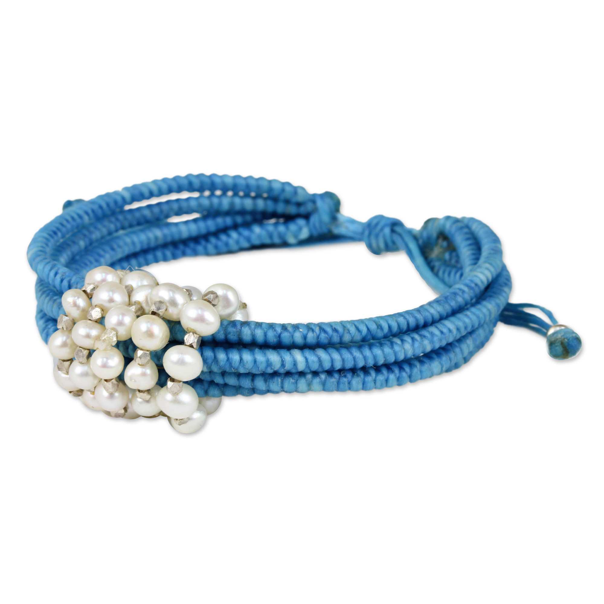 Linking five strands of knotted cords in soft sky blue, Napapat crafts a bracelet of modern femininity. The wristband is centered by five rows of white cultured pearls. Tiny hill tribe silver 950 beads accentuate the lovely wristband.